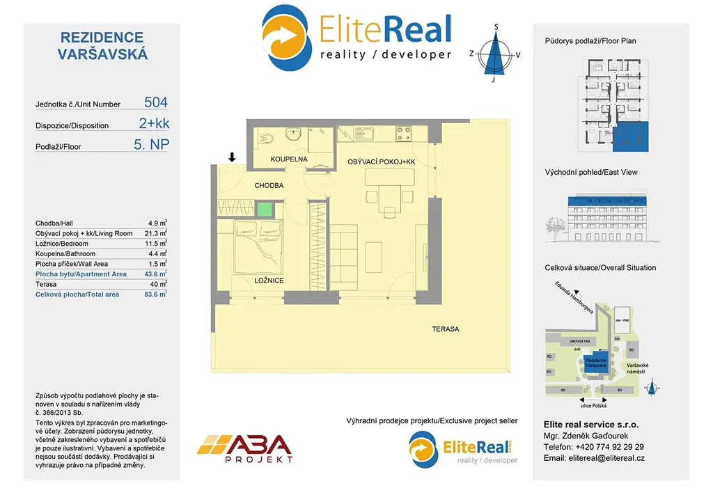 Bytová jednotka 2+kk 504 je situována v 5.NP, je orientována na jihovýchod. Plocha jednotky 43,6 m2 + plocha terasy 40 m2. Zajistíme Vám bezplatně financování nemovitosti. Nabízíme klientům služby vlastního hypotéčního centra s výhodami, které jsme pro Vás s bankovními ústavy připravily. Kupte si nové nízkonákladové bydlení - bytový dům je zařazen do energetické třídy B. Půdorys bytové jednotky, který zde prezentujeme, je základní. Dispozici nové jednotky a design si můžete upravit dle vlastních požadavků. Jednotky je možno slučovat i rozdělovat dle fáze výstavby. Nechte si postavit nový byt dle vašich představ. Standardní vybavení bytů splňuje požadavky vysokého standardu a moderního bydlení (vinylová podlaha, obložkové zárubně, moderní keramické obklady, francouzské okno, atd.).
