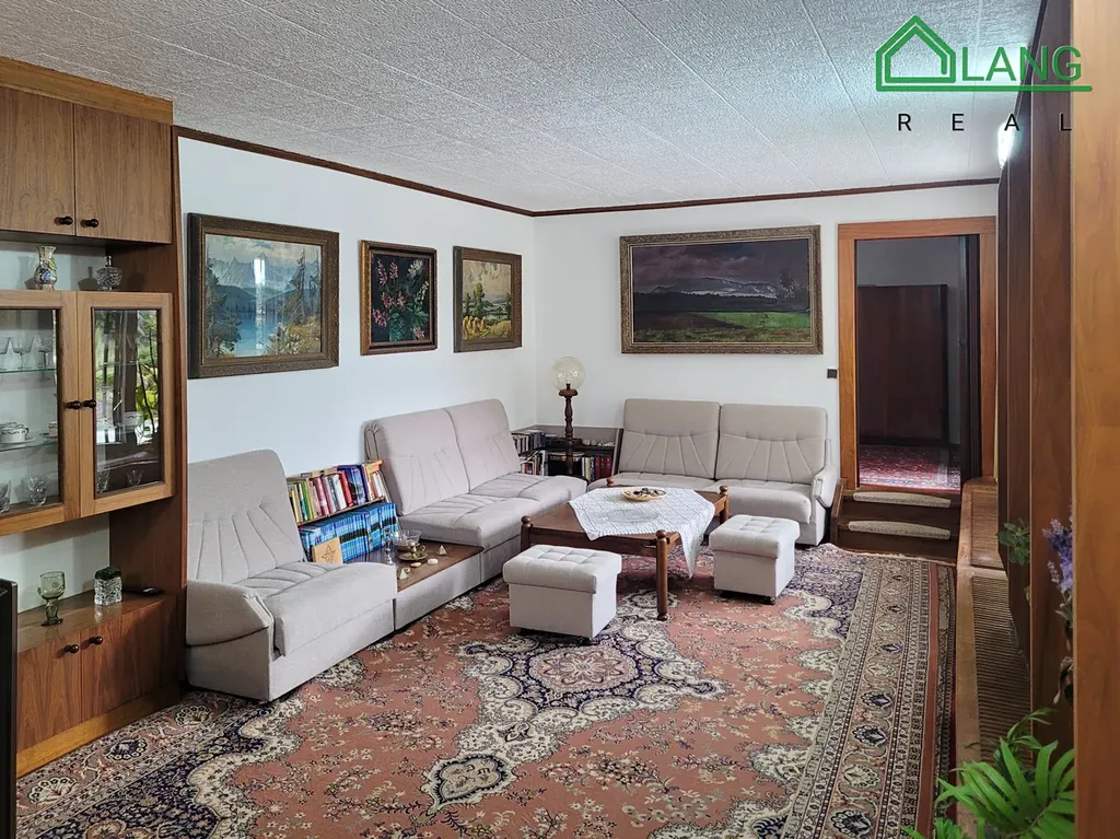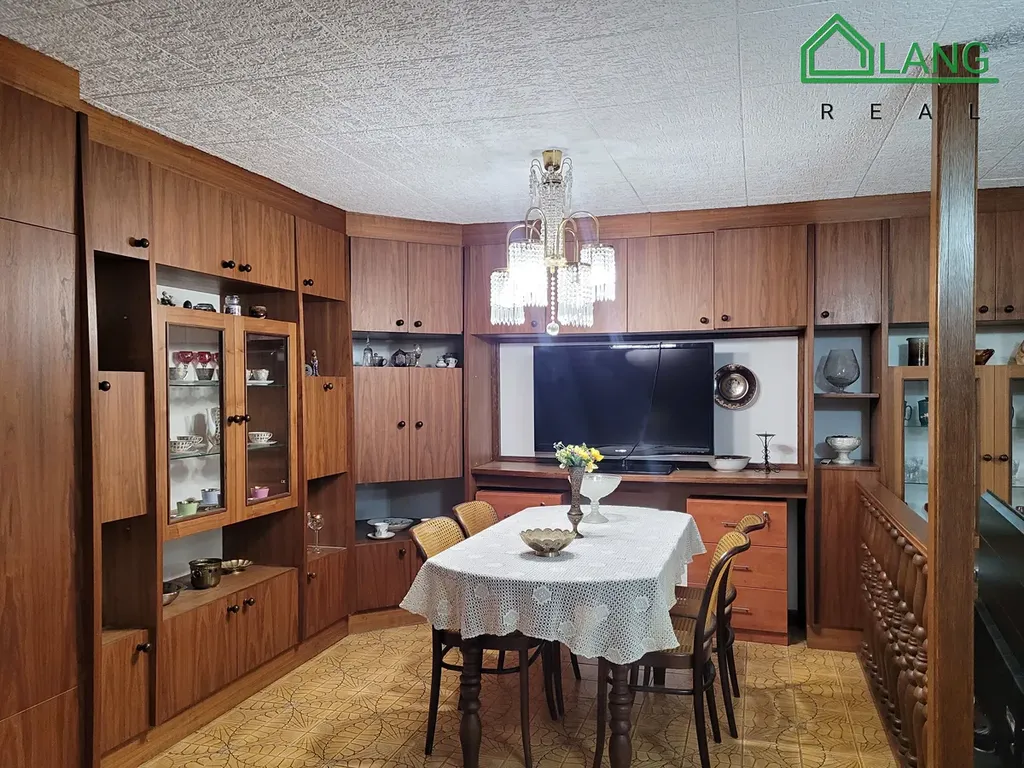 Prostorný obývací pokoj je zařízený rohovou rozkládací sedací soupravou s konferenčním stolkem a nábytkovou stěnou s televizí. V druhé částí obývacího pokoje je jídelna s nábytkovou stěnou zhotovenou na míru a s jídelním stolem a židlemi. Z jídelny je vstup do kuchyně.