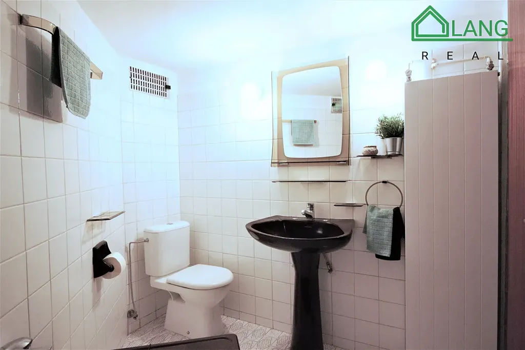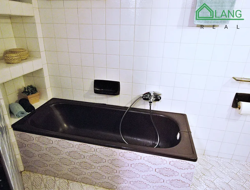 V koupelně je vana, umyvadlo a toaleta. V bytě je prádelna s novou pračkou, sušičkou a dalším úložním prostorem.