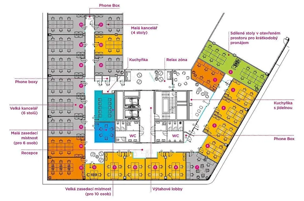 TECHNICKÉ PARAMETRY: V rámci ceny nájemného má klient k dispozici servis - jako služby recepce, úklid kanceláří, kapacitní internetové připojení, přístup 24/7, využití velkorysé kuchyňky s posezením, phone boxů a relax zóny. Dále je k dispozici jednací místnost k jednorázovému pronájmu a sdílená multifunkční tiskárna. Kanceláře dále nabízí otevíratelná okna, vnitřní žaluzie, individuální klimatizaci, regulaci vlhkosti, luxusní sociální zázemí, výtah, přístup přes magnetické karty, záložní generátor, bezpečnostní a požární systémy.