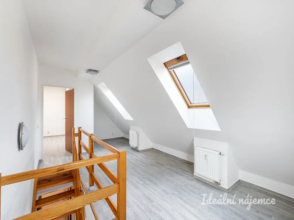 Exkluzivně k dlouhododobému pronájmu nabízíme hezký světlý, atypický mezonetový podkrovní byt 2+kk o rozloze 74 m2 v klidné rezidenční lokalitě pražského Radotína. K bytu náleží sklep v přízemí domu.