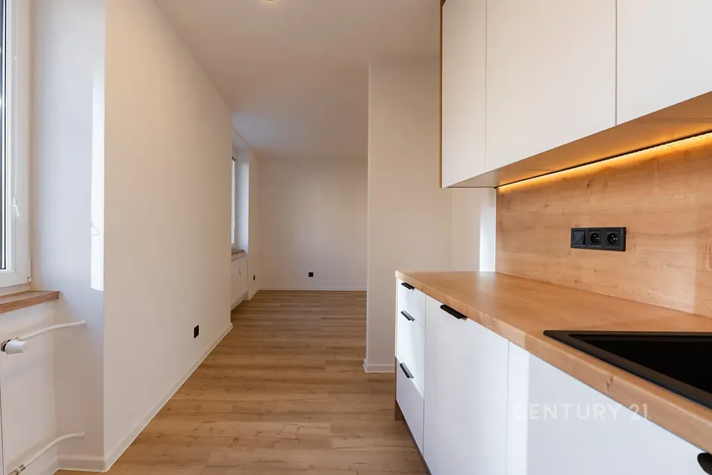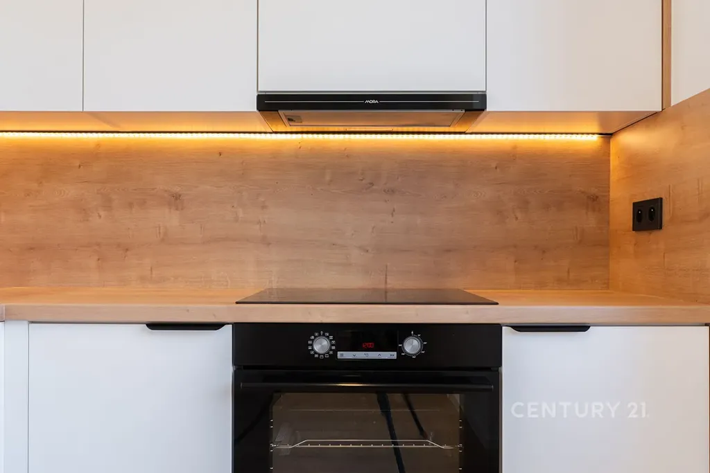 • Moderní prostorná kuchyňská linka (LED podsvícení) s vestavnými spotřebiči (myčka a elektrická trouba se sklokeramickou deskou)