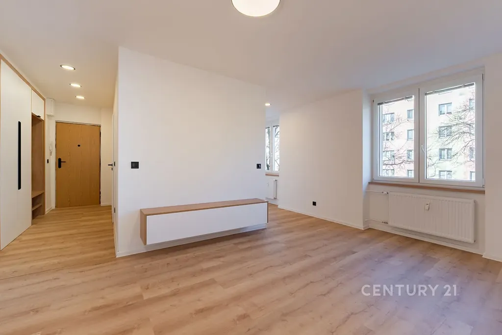 • Otevřený světlý obývací pokoj se stěnou na TV a skříňkou pod ni