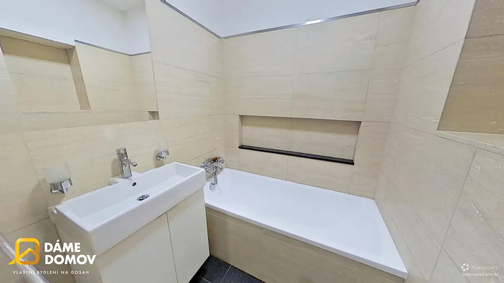 Koupelna s vanou, samostatné WC a vstupní chodba.