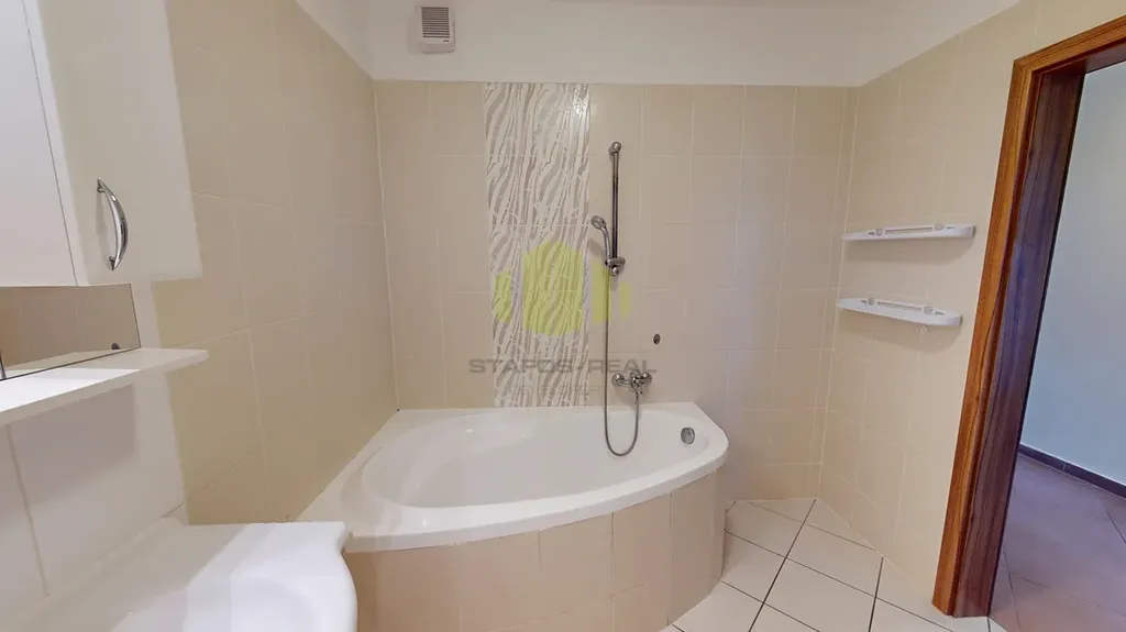 Dispozice bytu dále zahrnuje vstupní předsíň, praktickou šatnu s úložnými systémy na míru, koupelnu vybavenou rohovou vanou, umyvadlem se skříňkou, zrcadlem, otopným žebříkem a přípravou na myčku, samostatnou toaletu s umyvadlem a bidetovou sprchou a dále prostornou ložnici. Podlahové krytiny a kuchyňská linka jsou určeny k renovaci dle představ nového majitele, jinak je byt ve velmi dobrém, udržovaném stavu a připraven k okamžitému užívání.