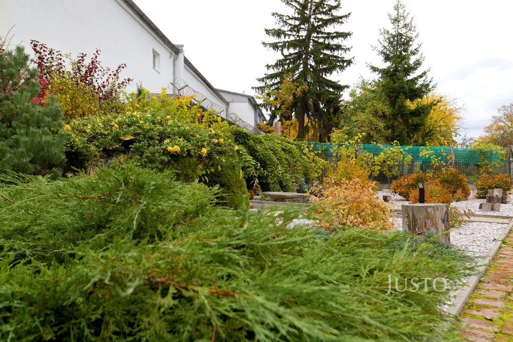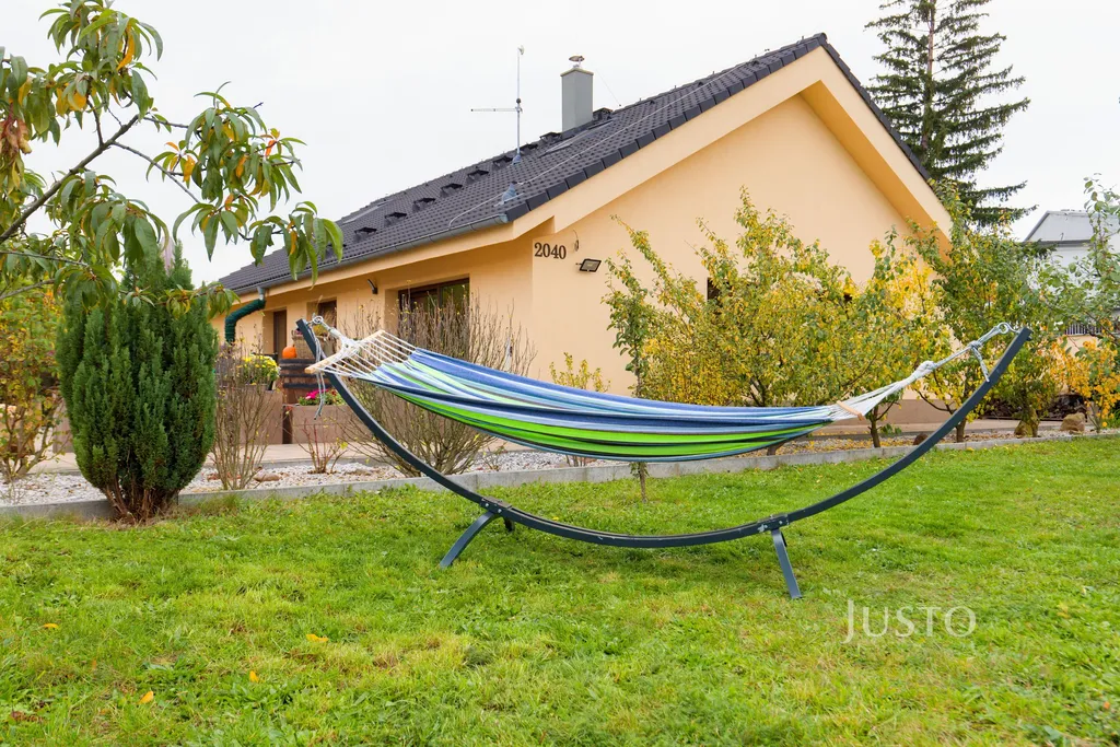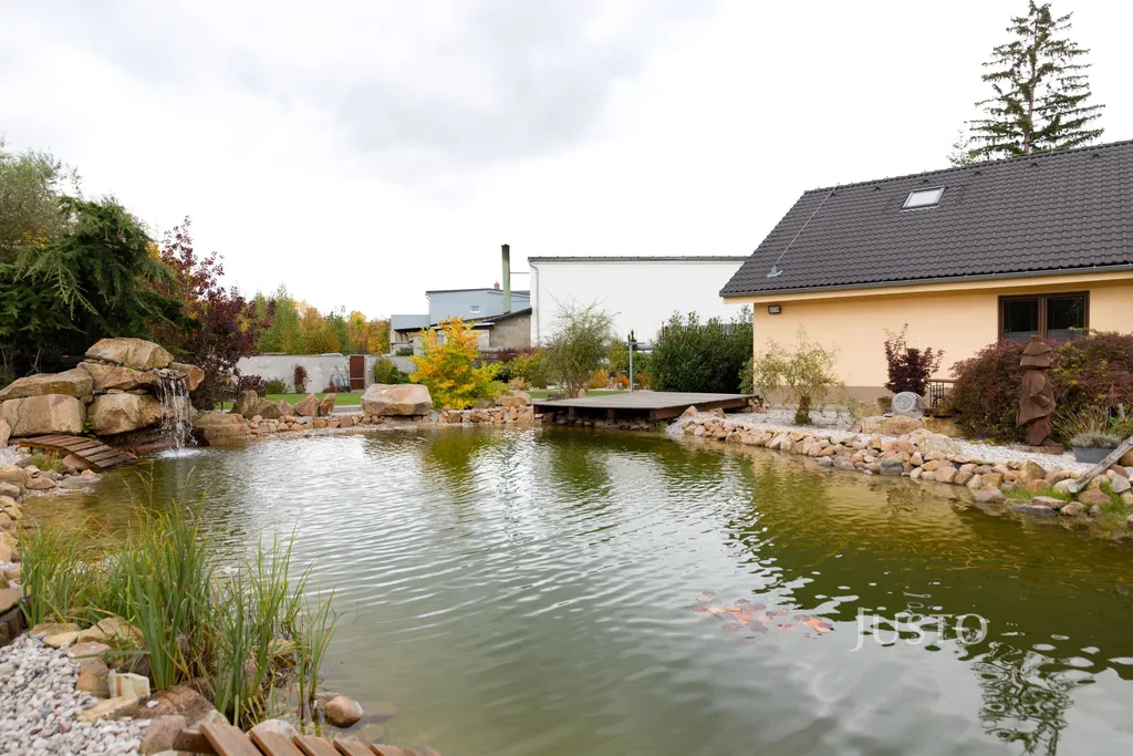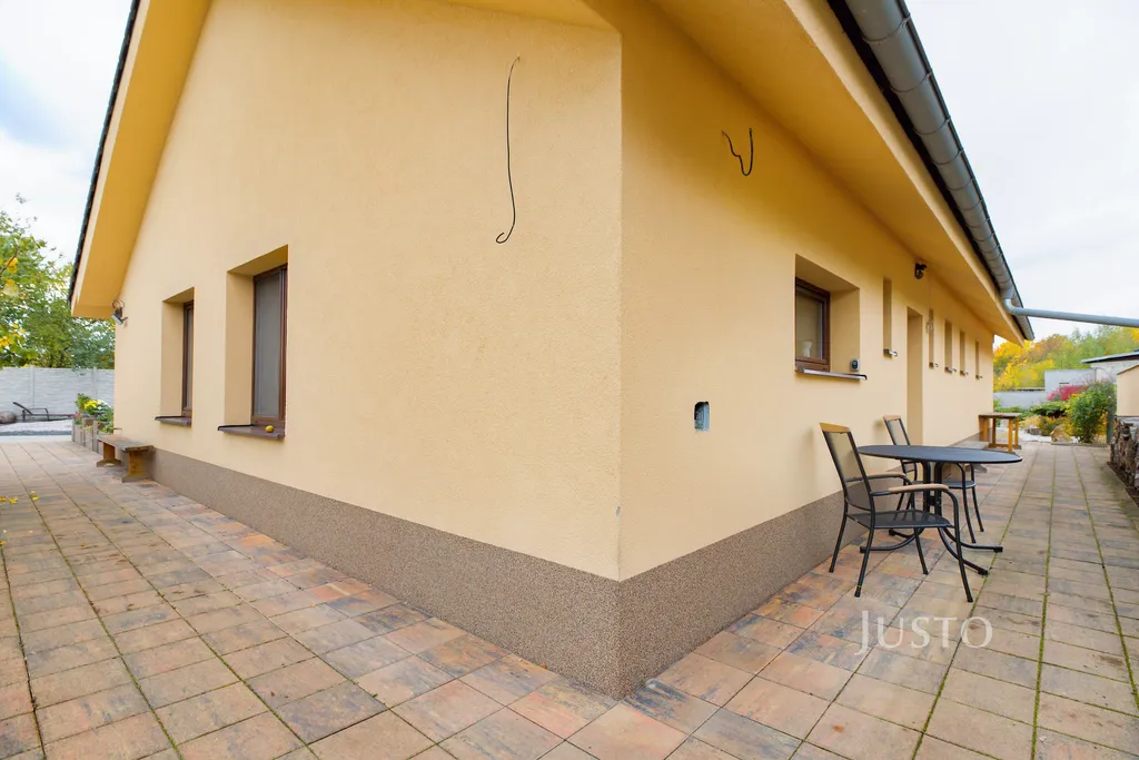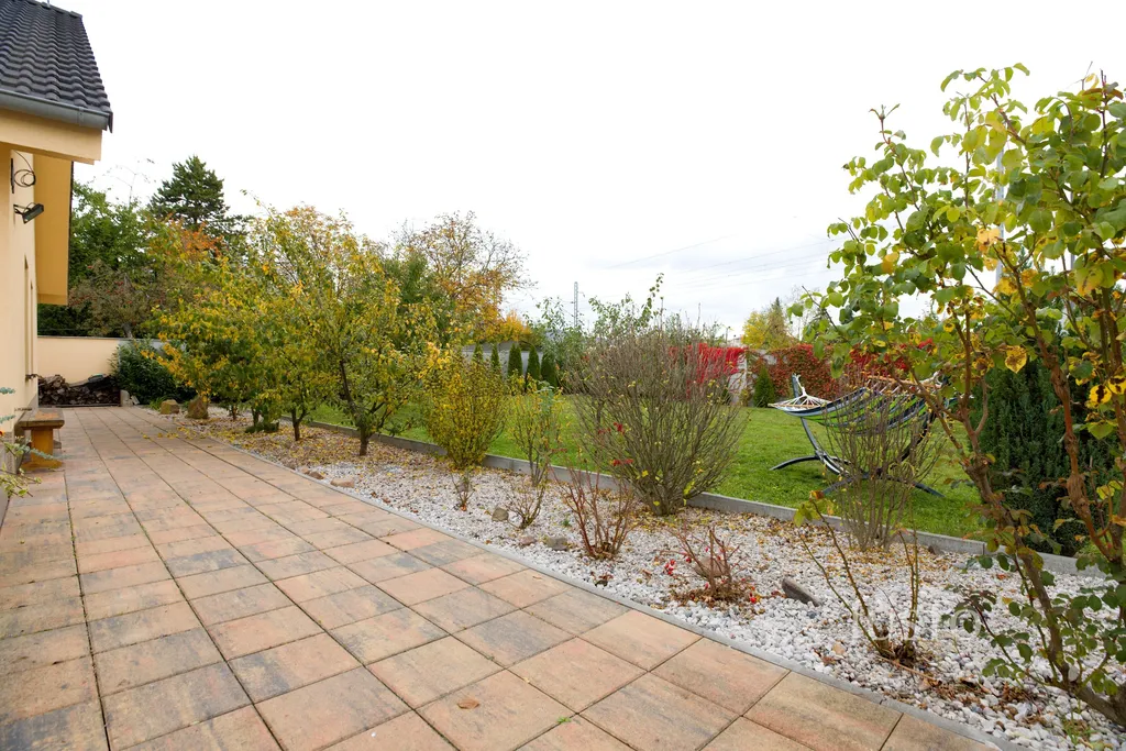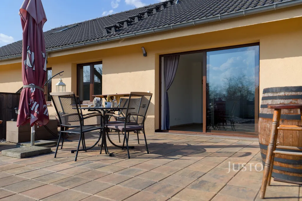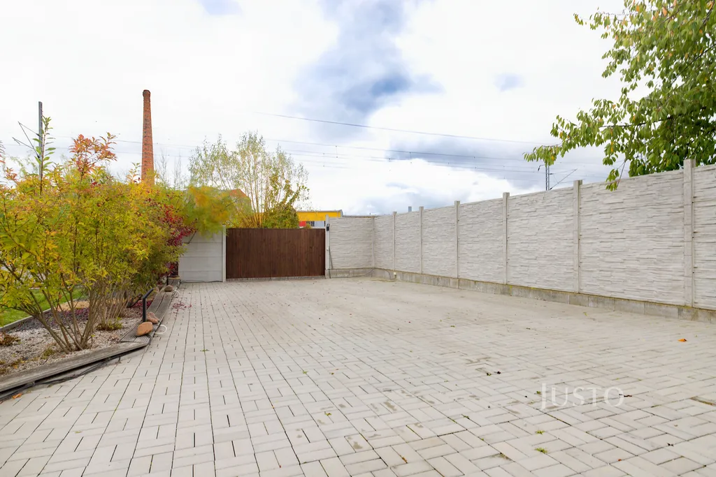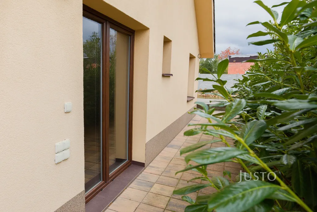 K domu náleží rozsáhlý vlastní pozemek o celkové rozloze 1819 m², z toho zahrada činí 1400 m². K dispozici je prostorná terasa, která je přímo propojena s obývacím prostorem velkými francouzskými okny, což podtrhuje propojení interiéru s exteriérem. Na pozemku je připraveno parkování až pro 4 vozy, celý prostor je oplocen a situován v klidné části obce.