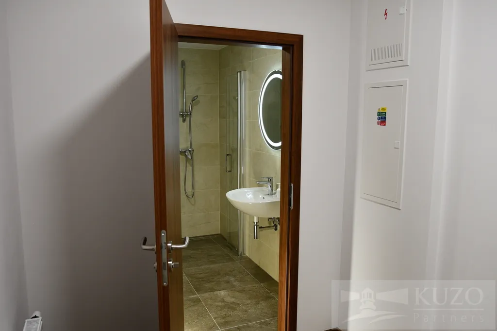 Koupelna je prostorná a vybavená sprchovým koutem, moderním prosvětleným, kruhovým zrcadlem. Příprava na pračku je samozřejmostí.