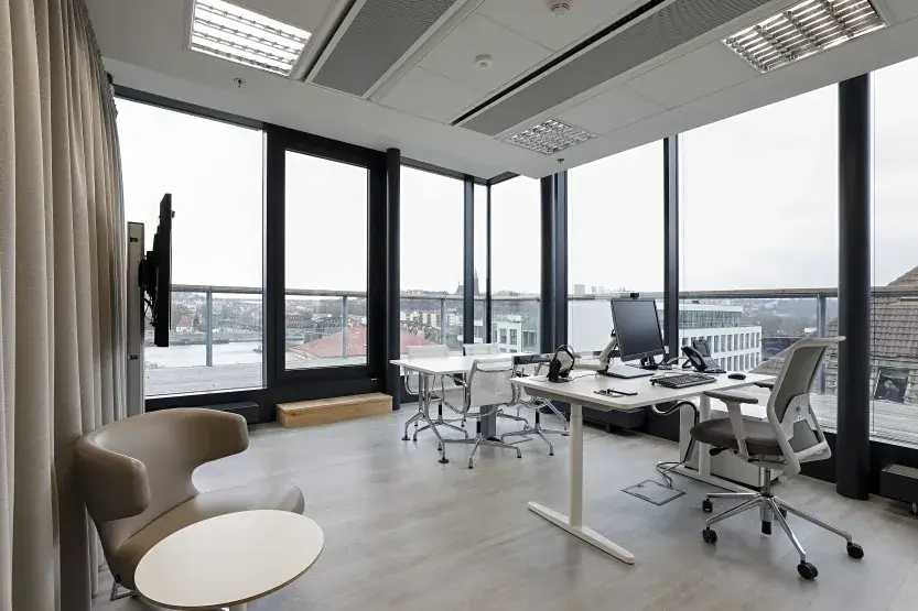 Budova FIVE vám nabízí jedinečnou příležitost pronájmu exkluzivní kanceláře v nejvyšším patře s výhledem na řeku a soukromou terasou o rozloze 200 m².