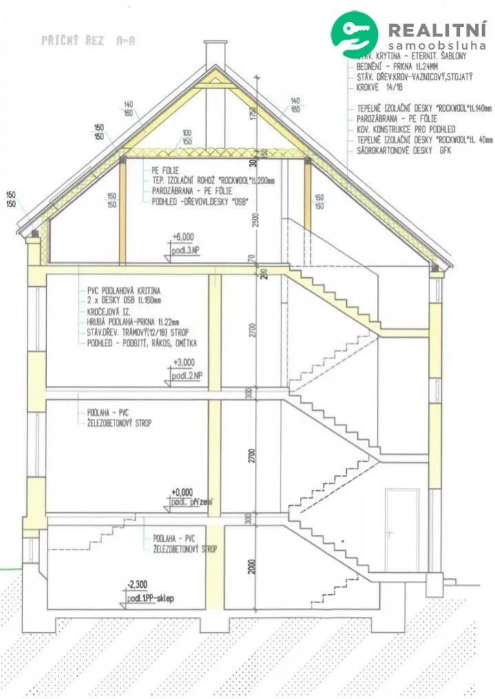 Okna jsou nová plastová, v podkroví dřevěná.