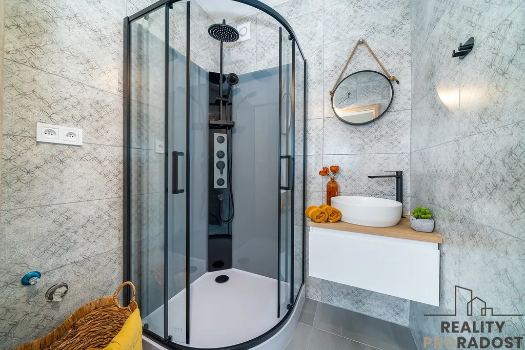 Byt má úplně novou kuchyňskou linku s vestavnou myčkou, el. troubou a sklokeramickou deskou a krásnou koupelnu se sprchovým koutem, WC je zvlášť. Byt se pronajímá nezařízený. Ve fotkách jsou přiloženy vizualizace možného uspořádání prostoru.