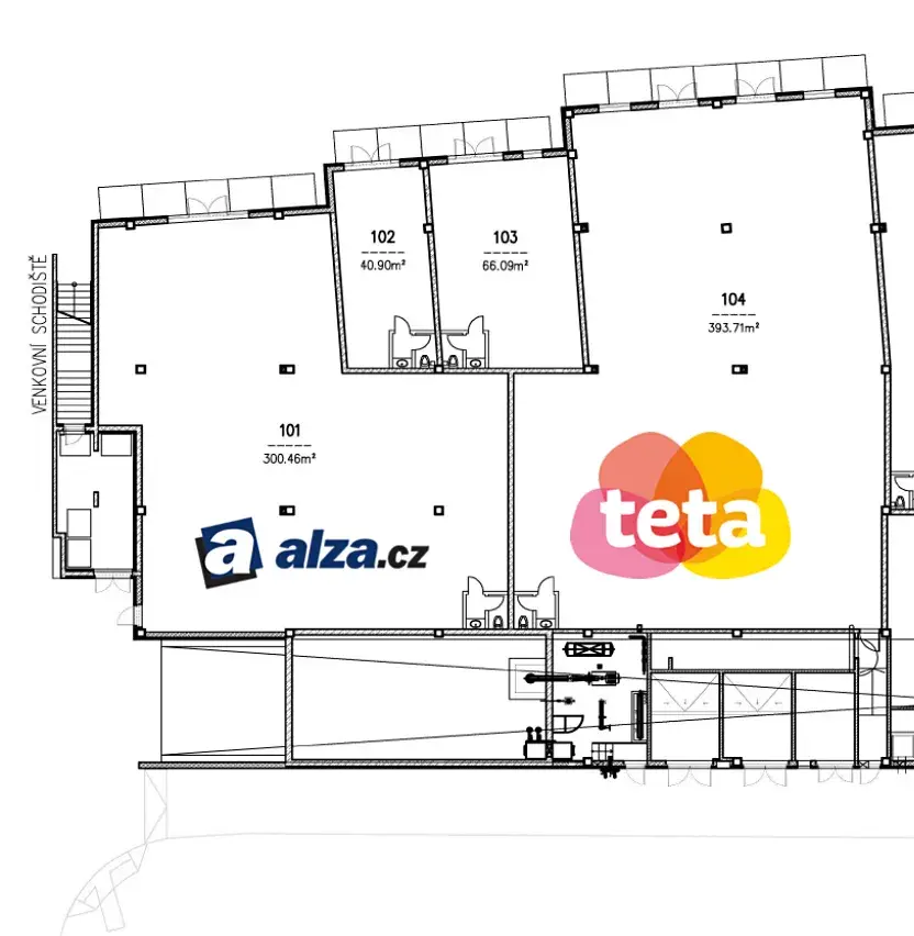 Samotná jednotka má přímý vstup z ulice, výbornou viditelnost a centrální polohu. Na plánku má jednotka 300 m², ale po změně má výměru cca 270 m².
