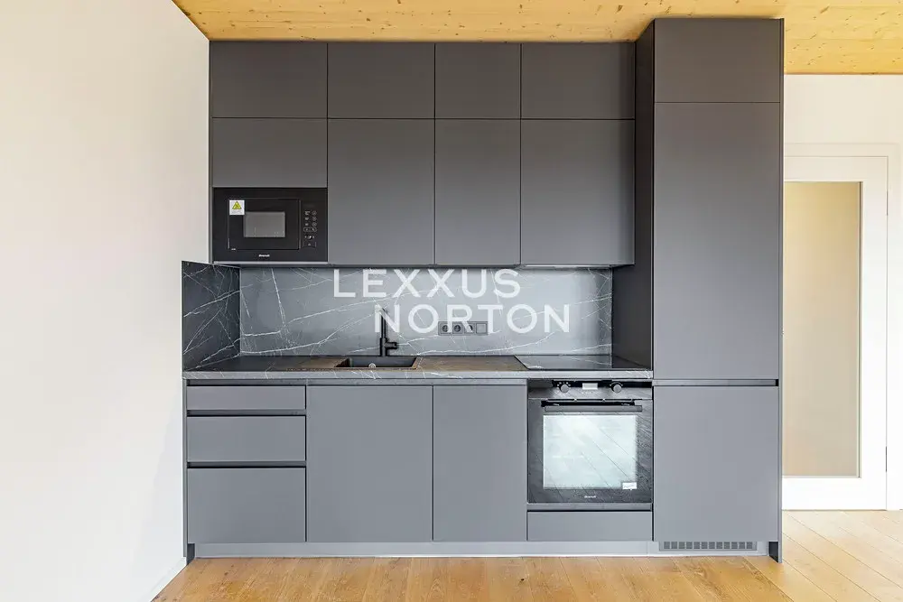 Kuchyňský kout je vybavený indukční varnou deskou, troubou, lednicí s mrazákem, mikrovlnnou troubou a myčkou nádobí. Vstupní chodba disponuje vestavěnou skříní. Byt dále disponuje moderním smart home systémem Loxone, který umožňuje mimo jiné inteligentní ovládání venkovních žaluzií, regulaci podlahového vytápění a chlazení v každé místnosti či monitorování spotřeby vody a energie.