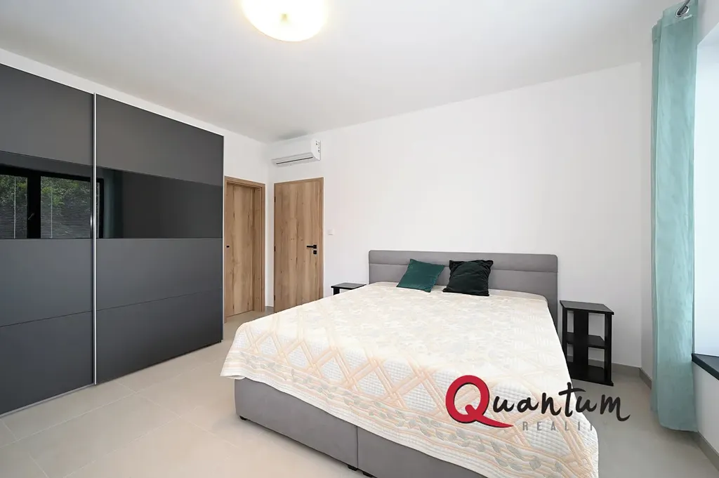 V patře najdete elegantně zařízenou ložnici se samostatným vstupem do koupelny s vanou i sprchou a další tři prostorné ložnice. Rovné střechy jsou okrasně osázeny celoročně kvetoucími barevnými rostlinami, které vytvářejí příjemnou atmosféru