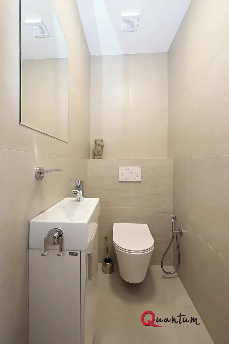 V přízemí domu se nachází prostorný a elegantně zařízený obývací pokoj s kompletně vybaveným kuchyňským koutem, dále pokoj, který může sloužit jako ložnice či pracovna a který je propojen s luxusní koupelnou s vanou i sprchou, bidetem a WC. Dále zde najdete halu s vestavěnými skříněmi, prostornou komoru pod schody, technickou místnost se sprchovým koutem a prostorem pro pračku a sušičku, sklad a samostatné WC. Z obývacího pokoje je přímý vstup na terasu a do vkusně upravené zahrady. Pro vaše pohodlí a bezpečnost jsou okna vybavena venkovními elektrickými žaluziemi a bezpečnostní systém, který je možno napojit na bezpečnostní pult, celé přízemí je bezbariérové.