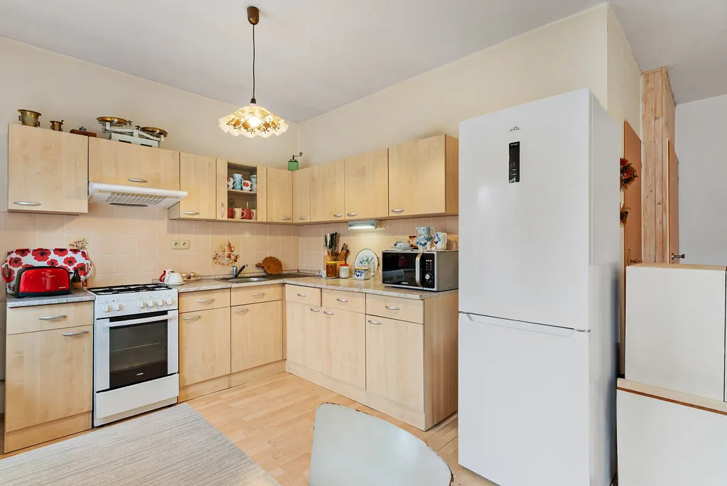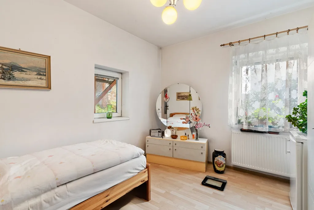 Novější zděná část (cca 15 let) je po celou dobu obývána a umožňuje okamžité bydlení. Dispozice aktuálně nabízí obytný prostor s kuchyní a velkorysé podkroví, které lze snadno upravit až na dva samostatné pokoje. Prostor je světlý, vzdušný a variabilní.