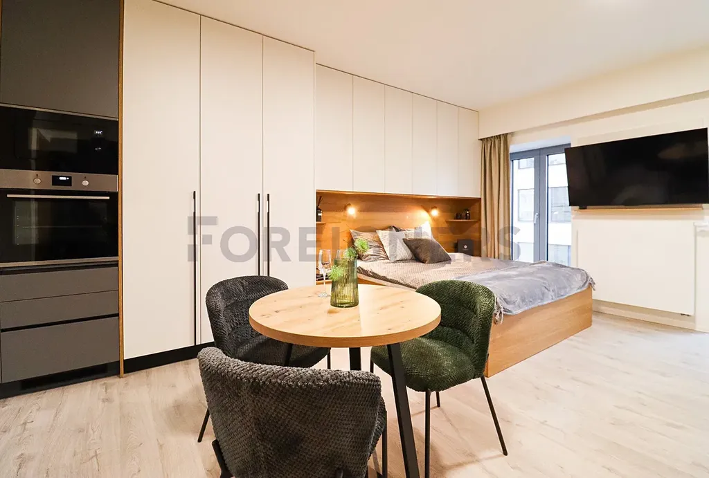 Byt je plně vybaven jídelním stolem s židlí, křeslem s konferenčním stolkem, TV + SAT, postelí, pračkou se sušičkou, skříněmi, poličkami, kuchyňským koutem, mikrovlnou troubou, lednicí, myčkou, konvicí atd.).Byt má francouzská okna. Sdílená kola ve dvoře. Možnost parkování ve dvoře nebo na oploceném parkovišti nedaleko budovy. Úklid společných prostor v ceně.