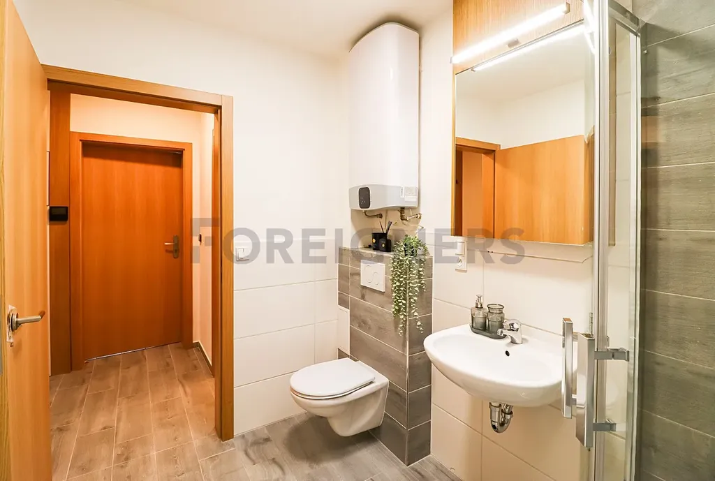 Byt se skládá ze vstupní chodby s úložnými prostory a malou šatnou, obytného pokoje s kuchyňským koutem, koupelny se sprchovým koutem a umyvadlem, toaletou a multifunkční pračkou se sušičkou. Tento moderní byt je ideální pro 1 až 2 osoby.
