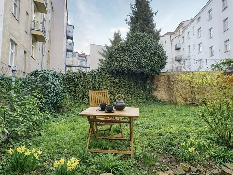 Z chodby vcházíme do velkorysého obývacího prostoru (28 m2) s klenutými stropy, jenž je aktuálně ložnicí s obývací částí, je však možnost jej přepažit a docílit tak dvou samostatných pokojů. Pokračujeme do prostoru s kuchyní a jídelnou (kuchyňská linka s ostrůvkem včetně vestavěných spotřebičů) komunikující se zahradou osvětlenou odpoledním sluncem. Samostatným vstupem z chodby se přesouváme do originálně řešené útulné koupelny, či na samostatné WC. Byt disponuje též praktickou šatnou a úklidovou komorou.