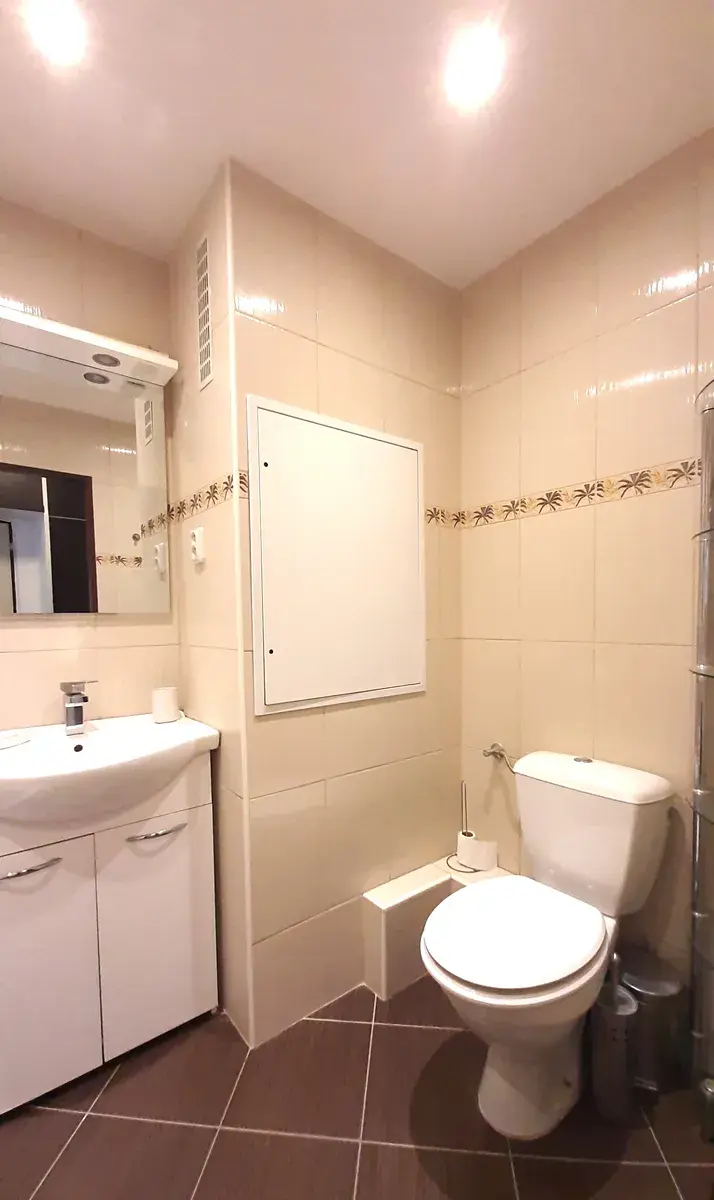 Samotný interiér bytu vás potěší svou světlostí a promyšleným úložným prostorem. Srdcem domova je obývací pokoj s kuchyňským koutem, odkud je přímý vstup na lodžii. Kuchyně je vybavena vším potřebným pro každodenní vaření. V bytě dále najdete dvě samostatné ložnice, z nichž jedna je vybavena stylovým bílým dvojlůžkem. Velkou výhodou je prostorná předsíň s vestavěnými skříněmi a samostatná komora s regály, takže o místo na věci nebudete mít nouzi. Koupelna disponuje sprchovým koutem a k dispozici je i automatická pračka.