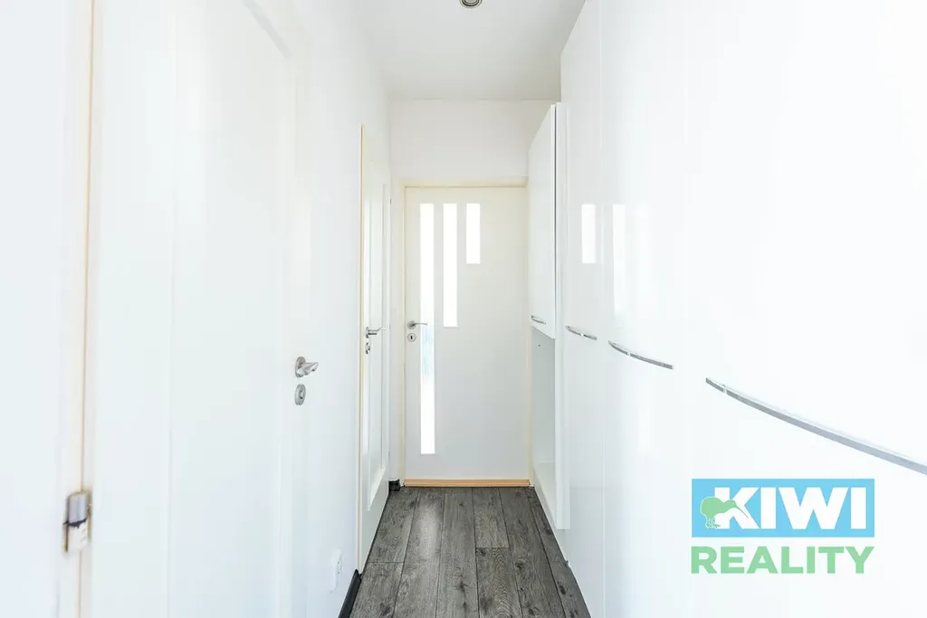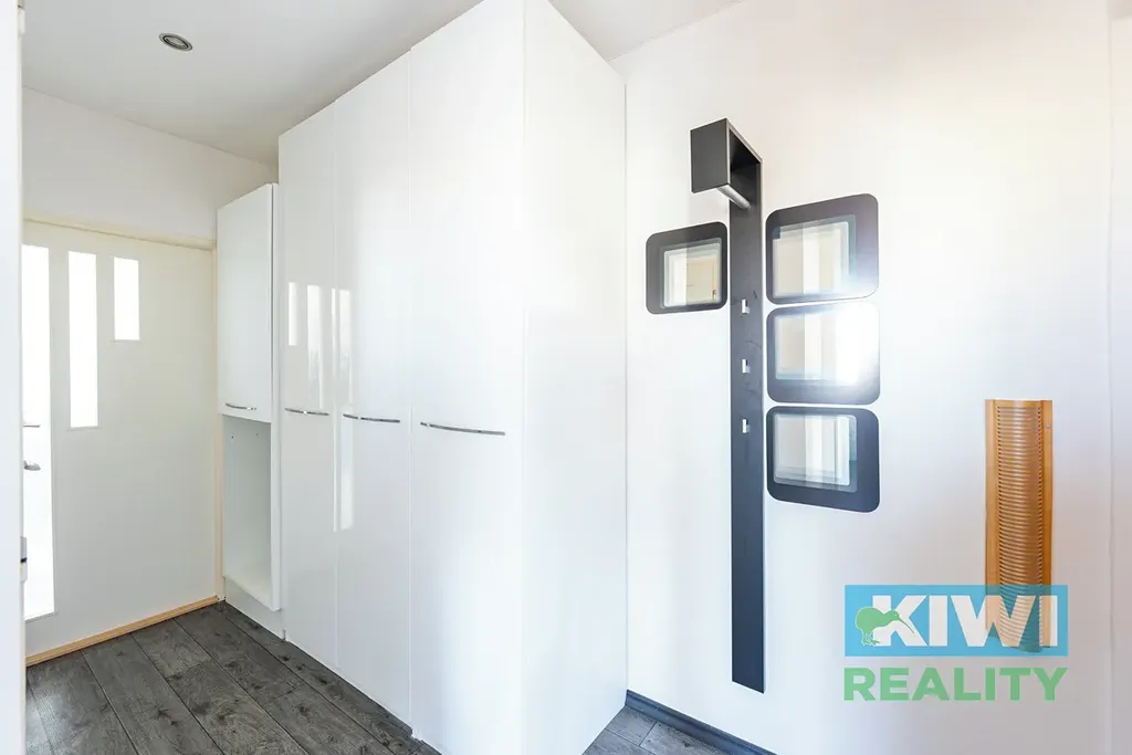 V ložnici je k dispozici manželská postel a prostorné skříně, takže úložného prostoru je zde dostatek. Kuchyňská linka je vybavena veškerými spotřebiči včetně lednice a myčky a nechybí ani prostor pro připojení pračky. Na chodbě najdete další vestavěné skříně, které výrazně zvyšují komfort bydlení. Obývací pokoj je zařízen rozkládací pohovkou, konferenčním stolkem, televizním stolkem, skříněmi, skládací postelí a dokonce i televizí. Jednoduše řečeno – stačí si zabalit kufry a můžete bydlet.