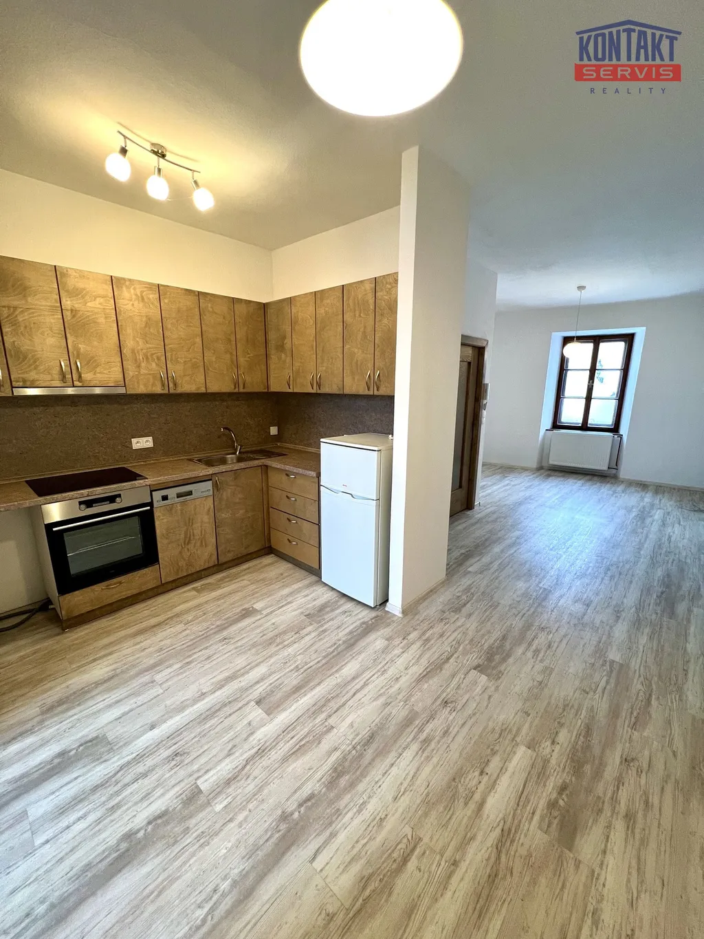 Dominantou bytu je prostorná kuchyňská část, která nabízí dostatek místa nejen pro vaření, ale i pro běžné fungování a posezení. Kuchyň je vybavena varnou deskou, troubou, myčkou nádobí a lednicí s mrazákem. Nechybí ani dostatek úložného prostoru. Vybaveno také pračkou.