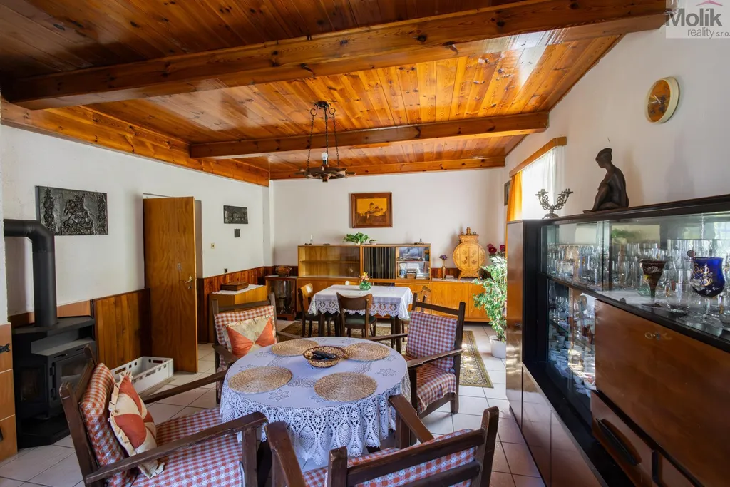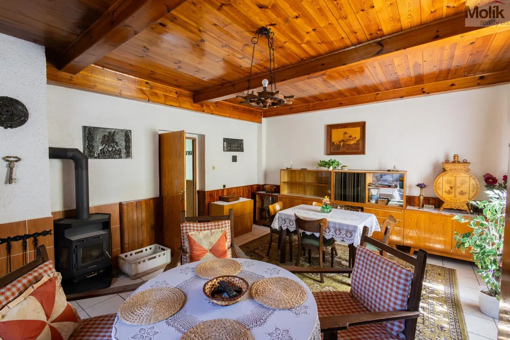 V domě se nachází 3 pokoje, kuchyň a obývací pokoj s krbem.