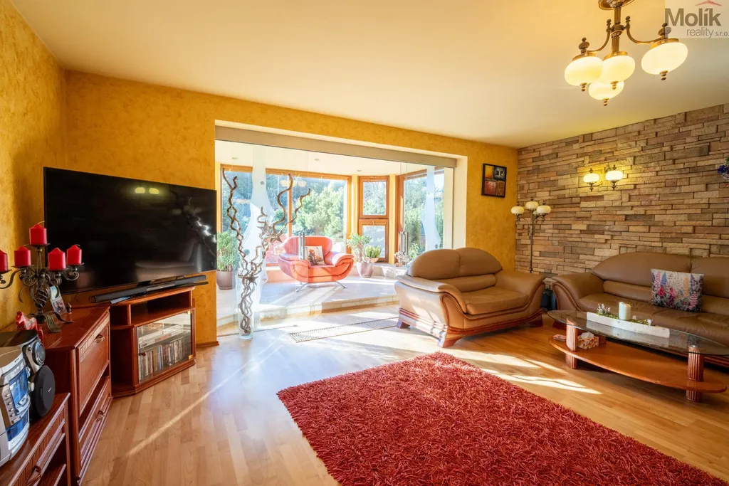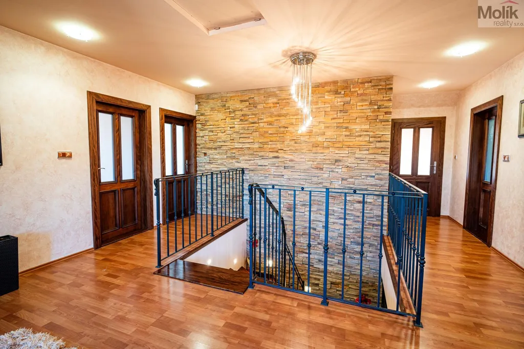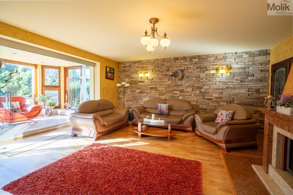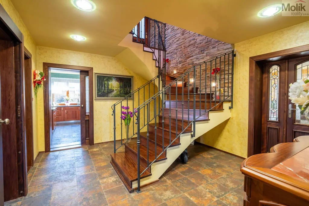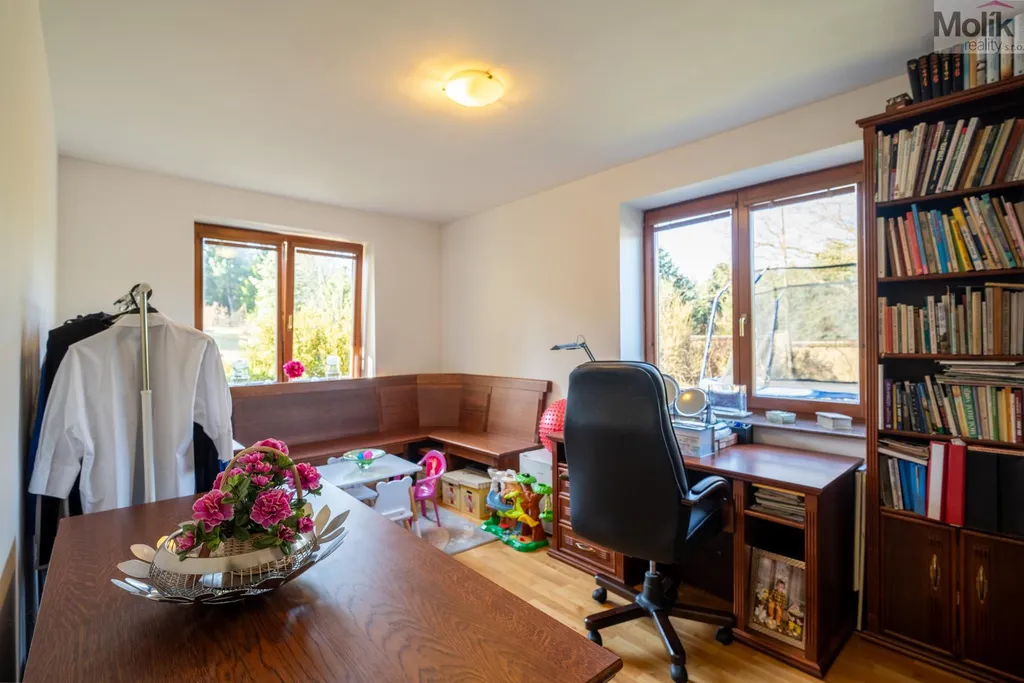 Patro domu nabízí čtyři prostorné pokoje a hlavní koupelnu s plně funkční saunou. Praktickou stránku bydlení doplňuje garáž s elektrickými vraty. Dominantou celého sídla je však jeho exteriér. Na rozlehlém pozemku, který díky své ploše přes 3 500 m and sup2; poskytuje maximální soukromí, se nachází vzrostlé jehličnany, borovice i plodící jabloně. Zahrada nabízí krytý bazén s filtrací, jezírko s vlastním čistícím systémem a splachem, a také prostorný altán s grilem pro společné chvíle. Součástí pozemku je také praktický zahradní domek na techniku. Velkou výhodou jsou dva samostatné vjezdy: jeden vede k domu a garáži, druhý zajišťuje pohodlný přístup přímo na plochu zahrady. Nemovitost se nachází v chráněné krajinné oblasti, což zaručuje bydlení v naprostém klidu a v těsném sepětí s přírodou.