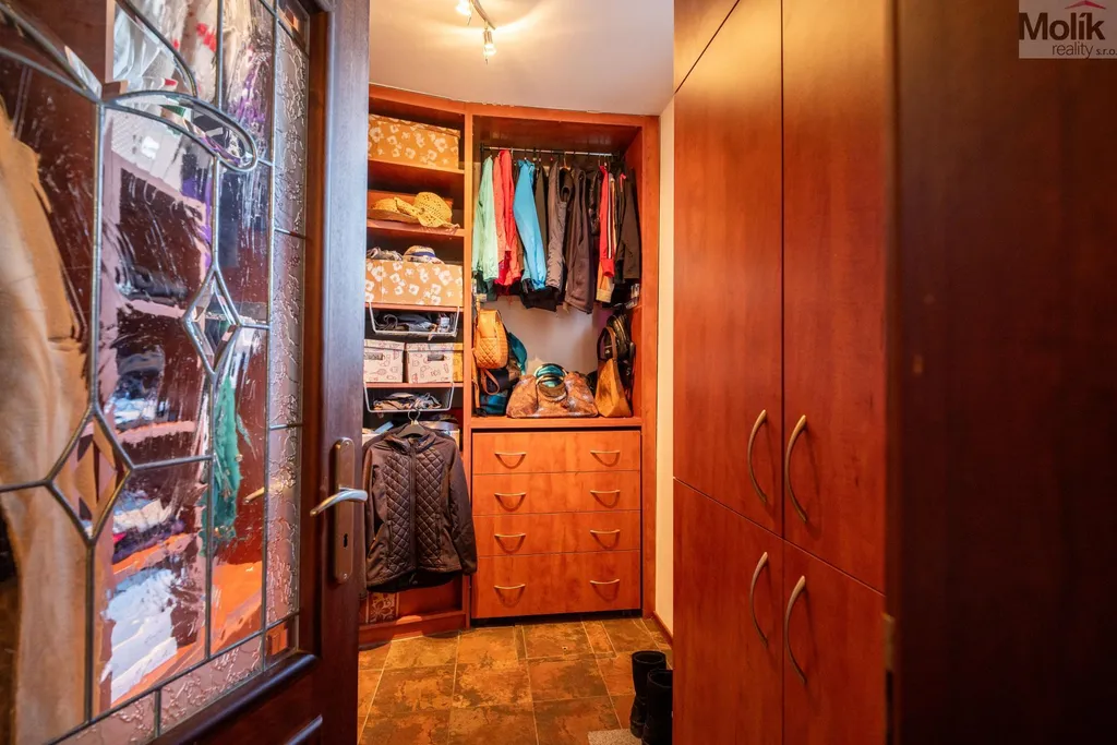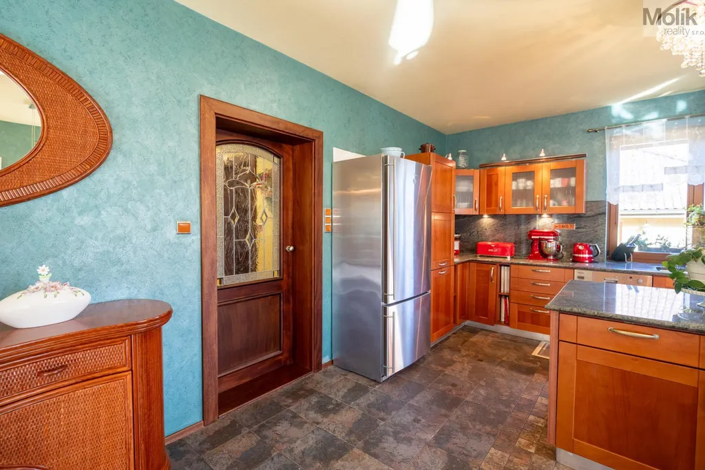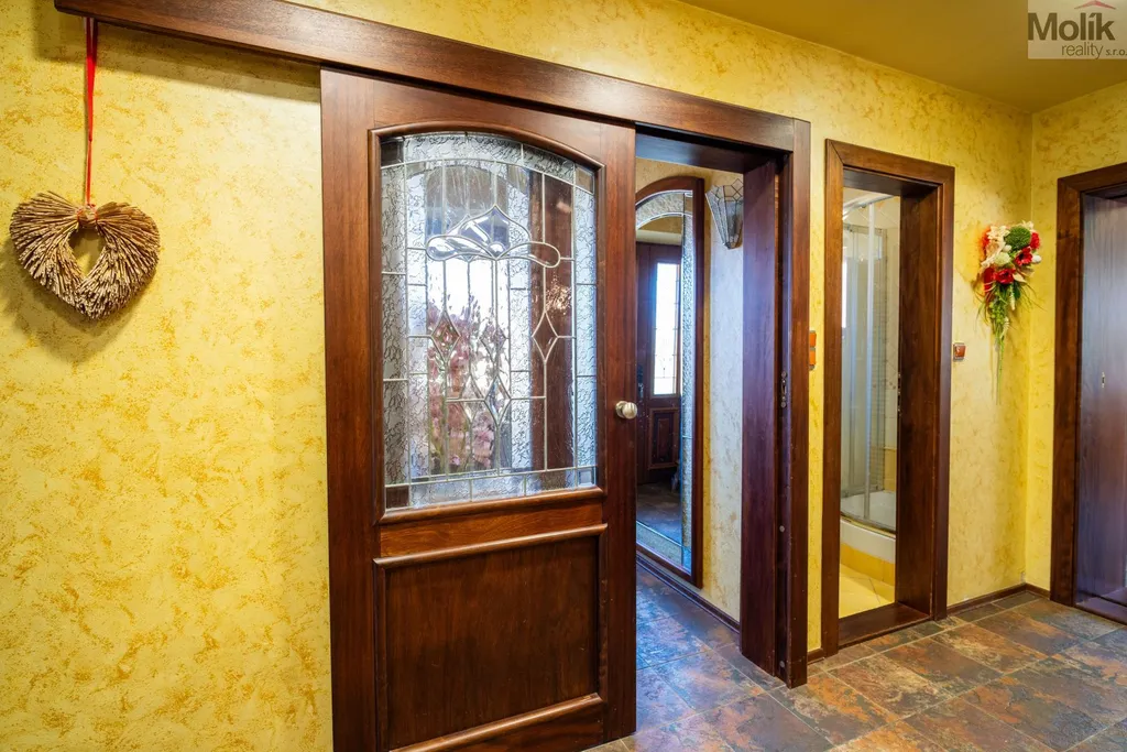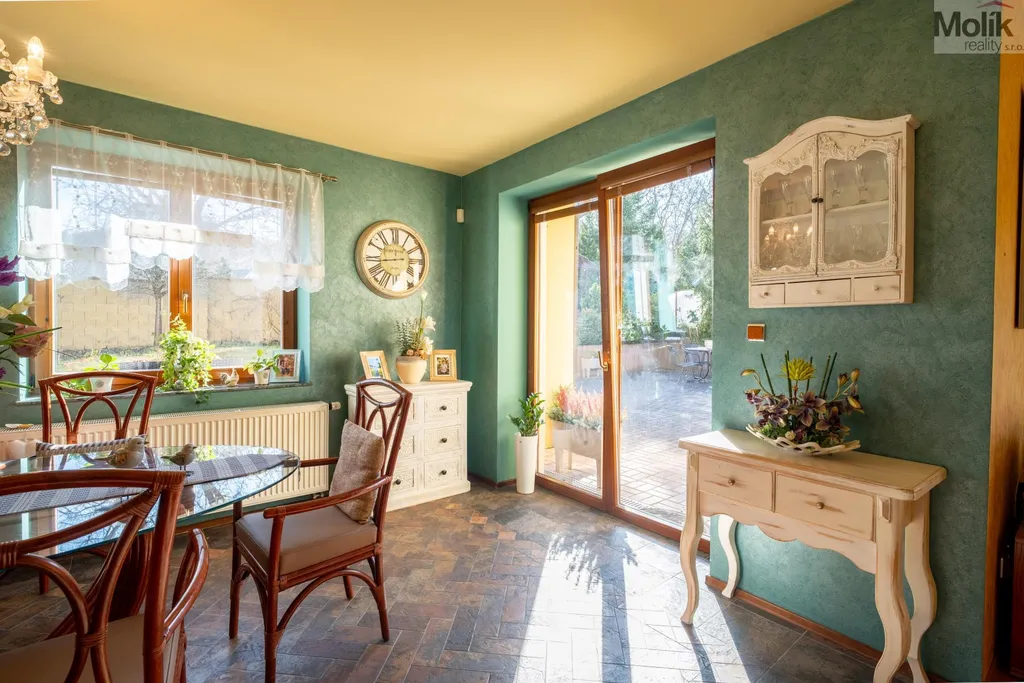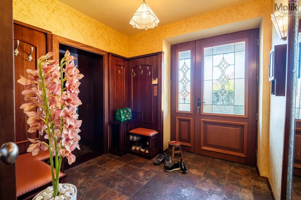 Patro domu nabízí čtyři prostorné pokoje a hlavní koupelnu s plně funkční saunou. Praktickou stránku bydlení doplňuje garáž s elektrickými vraty. Dominantou celého sídla je však jeho exteriér. Na rozlehlém pozemku, který díky své ploše přes 3 500 m and sup2; poskytuje maximální soukromí, se nachází vzrostlé jehličnany, borovice i plodící jabloně. Zahrada nabízí krytý bazén s filtrací, jezírko s vlastním čistícím systémem a splachem, a také prostorný altán s grilem pro společné chvíle. Součástí pozemku je také praktický zahradní domek na techniku. Velkou výhodou jsou dva samostatné vjezdy: jeden vede k domu a garáži, druhý zajišťuje pohodlný přístup přímo na plochu zahrady. Nemovitost se nachází v chráněné krajinné oblasti, což zaručuje bydlení v naprostém klidu a v těsném sepětí s přírodou.