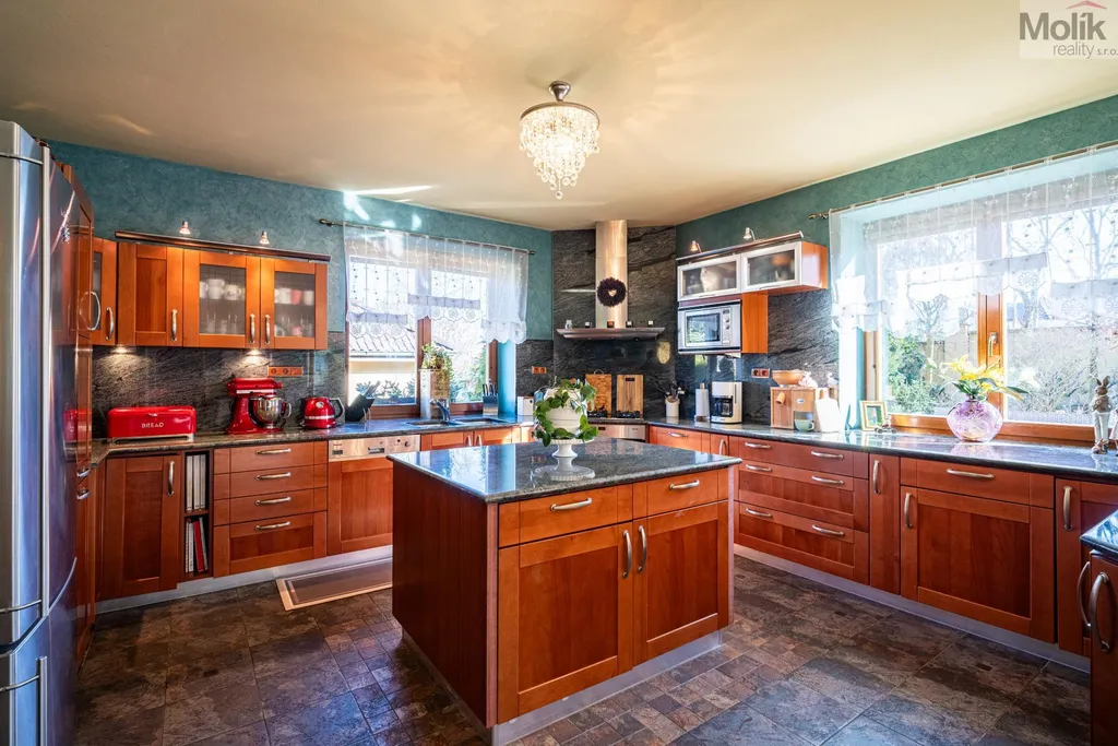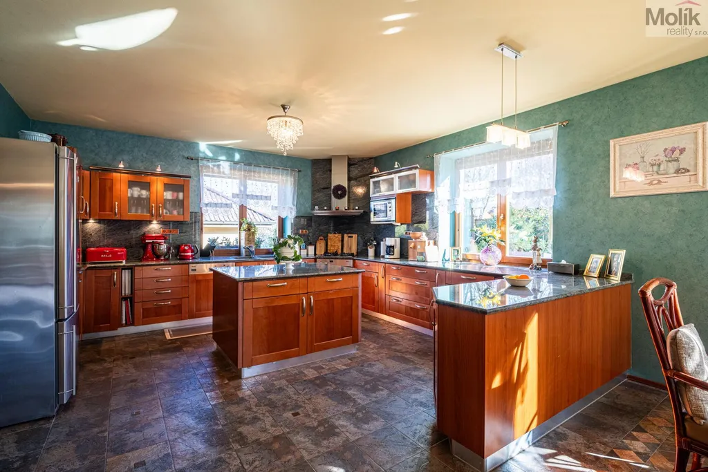 Srdcem přízemí je prosluněný obývací pokoj s krbem doplněným o mramorové prvky. Na něj navazuje moderní kuchyně s pracovní deskou z přírodní žuly a prosklená zimní zahrada, která díky velkorysému prosklení otevírá výhledy do rozlehlé zahrady.