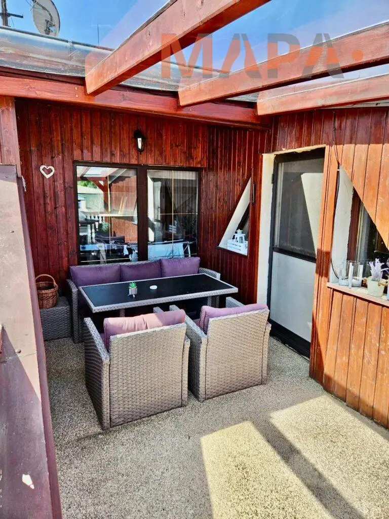 Součástí bytu je zastřešená terasa s možností posezení, která poskytuje příjemné soukromí a výhled do okolí.