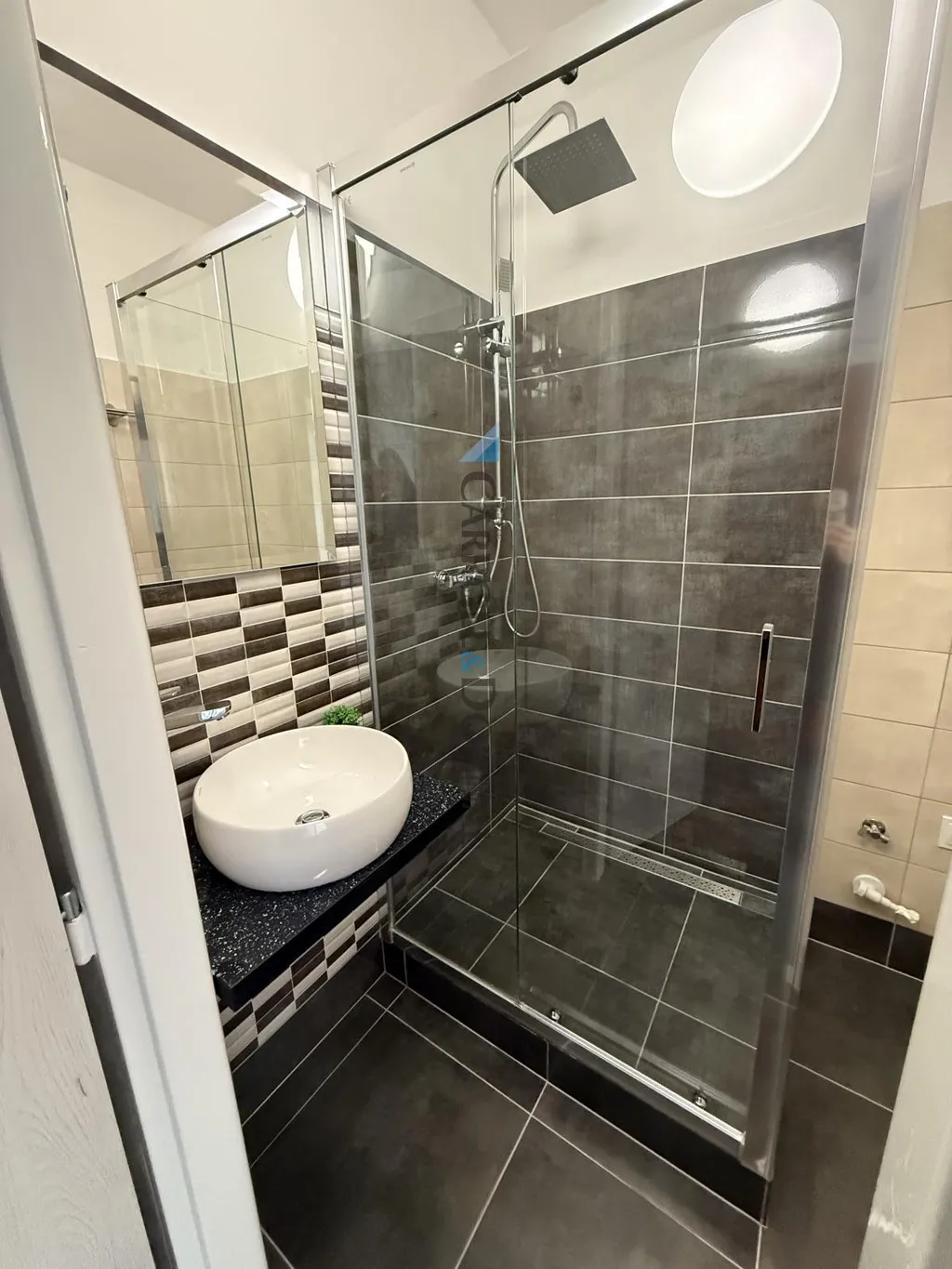 Koupelna se sprchovým koutem je elegantní, nabízí i prostor pro pračku.