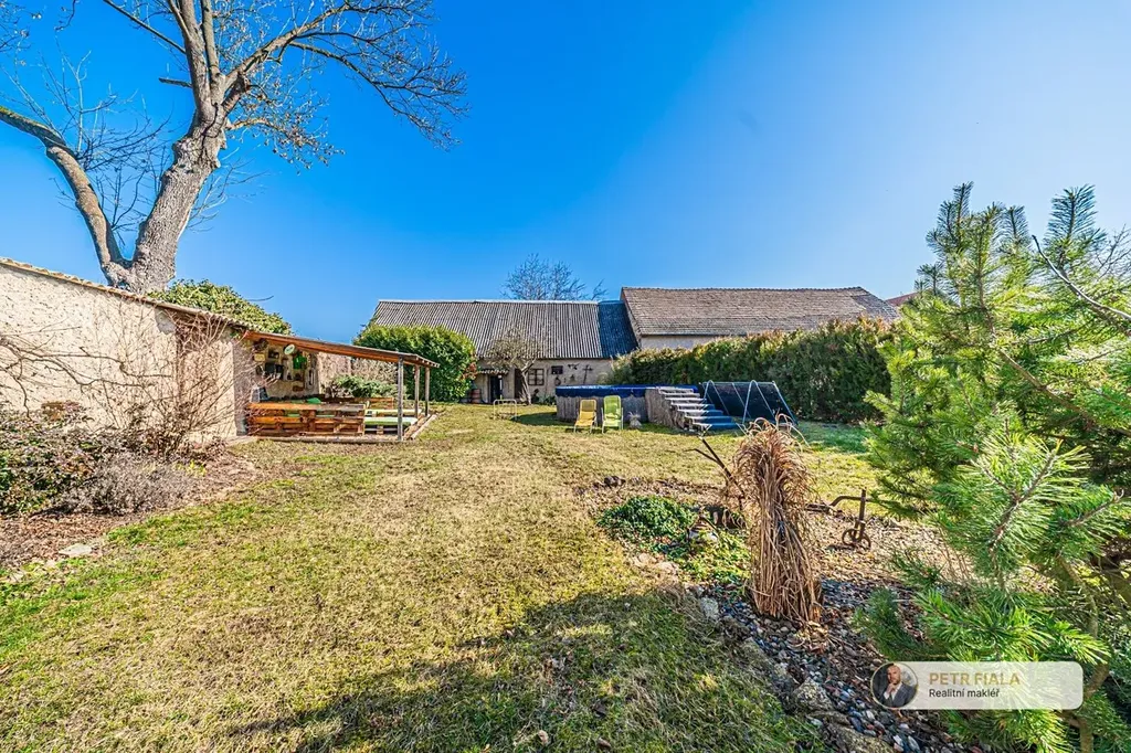 Dvůr doplňují dřevník, terasa s posezením, vlastní studna a jímka na dešťovou vodu.