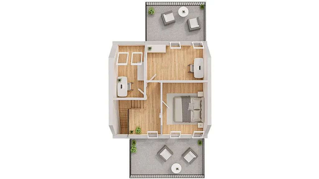 Velkou předností bytu jsou dvě prostorné terasy o velikostech 14,1 m² a 17,4 m², které poskytují ideální místo pro relaxaci, posezení s rodinou či přáteli nebo vytvoření vlastní zelené oázy přímo v centru města.