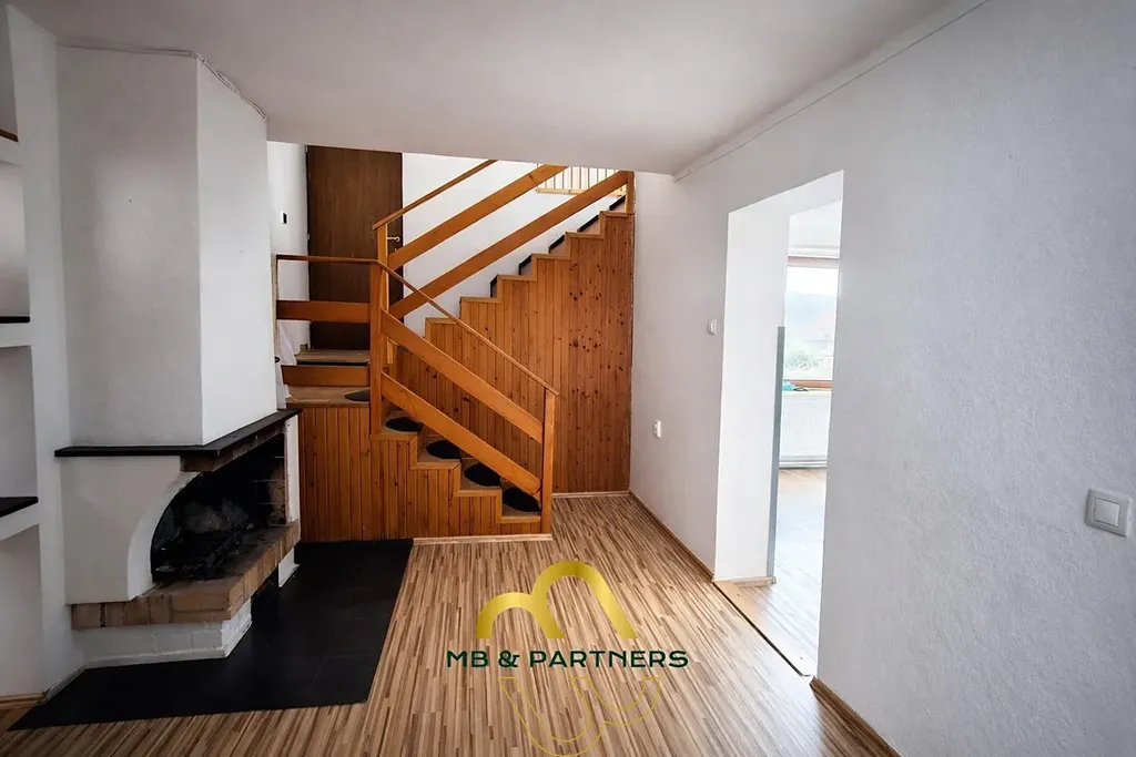 Tato horní část domu nabízí prostorný obývací pokoj, úložné prostory, koupelnu se sprchovým koutem, 3 samostatné ložnice, terasu s orientací na S-V a nádherným výhledem na okolní kopce.