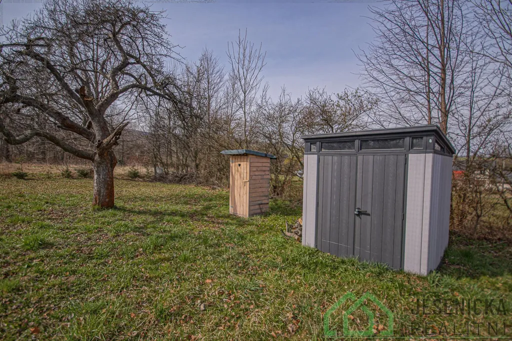 V zadní části pozemku je umístěna zahradní bouda vhodná k uskladnění nářadí a také suché WC.