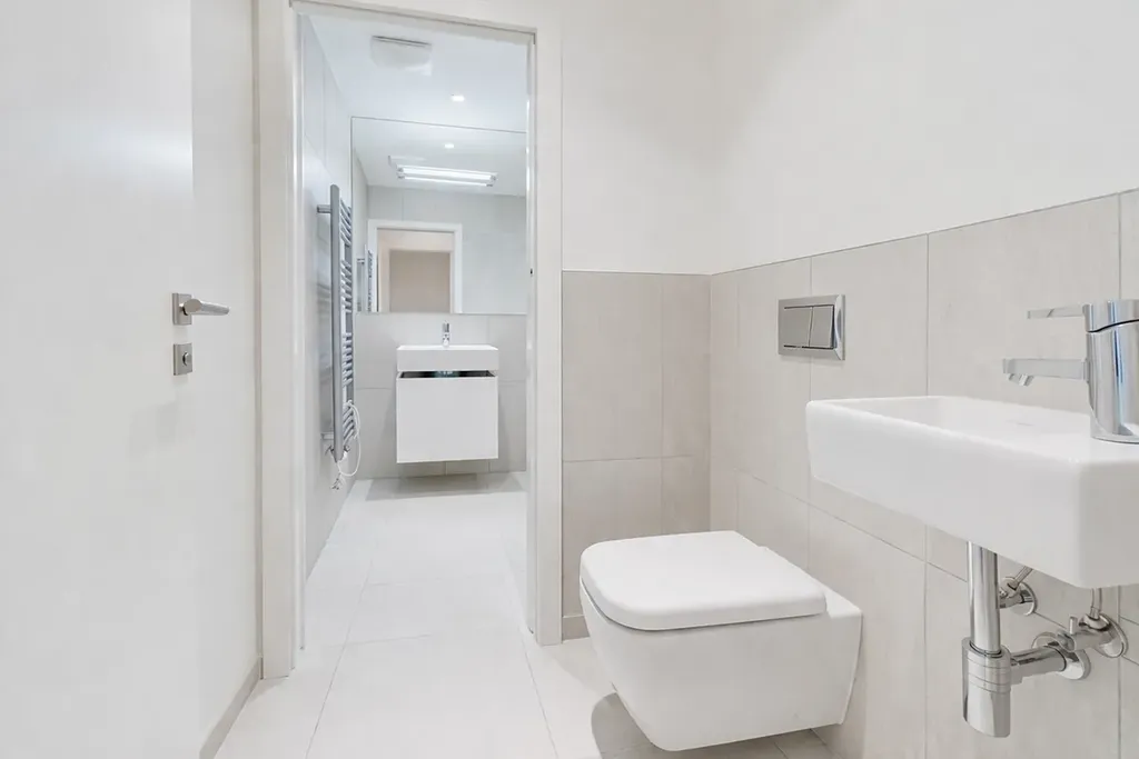 Podlahové krytiny tvoří kvalitní plovoucí podlahy v kombinaci s velkoformátovou dlažbou, které podtrhují celkový moderní vzhled bytu.