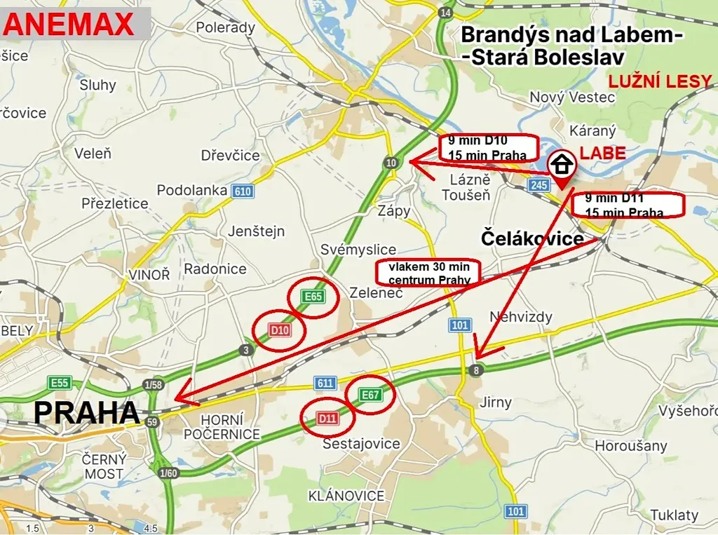 DOPRAVNÍ DOSTUPNOST do centra Prahy je výborná - každých 30 minut jezdí vlak. Z Čelákovic se také velmi rychle dostanete na dálnici D10 a D11 – Praha Černý Most cca 15 min.