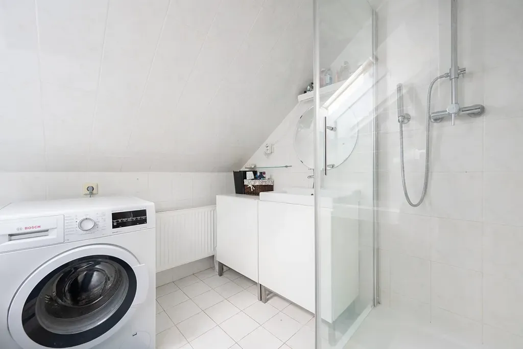 V chodbě je prostorná koupelna s vanou a sprchovým koutem, je zde i místo na pračku. Toaleta je samostatná.