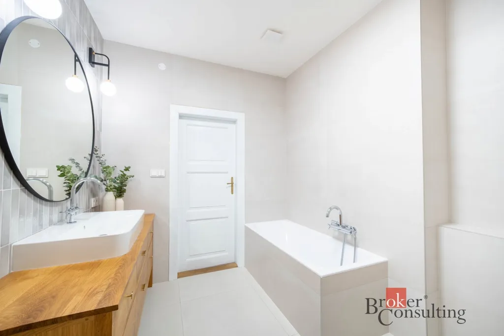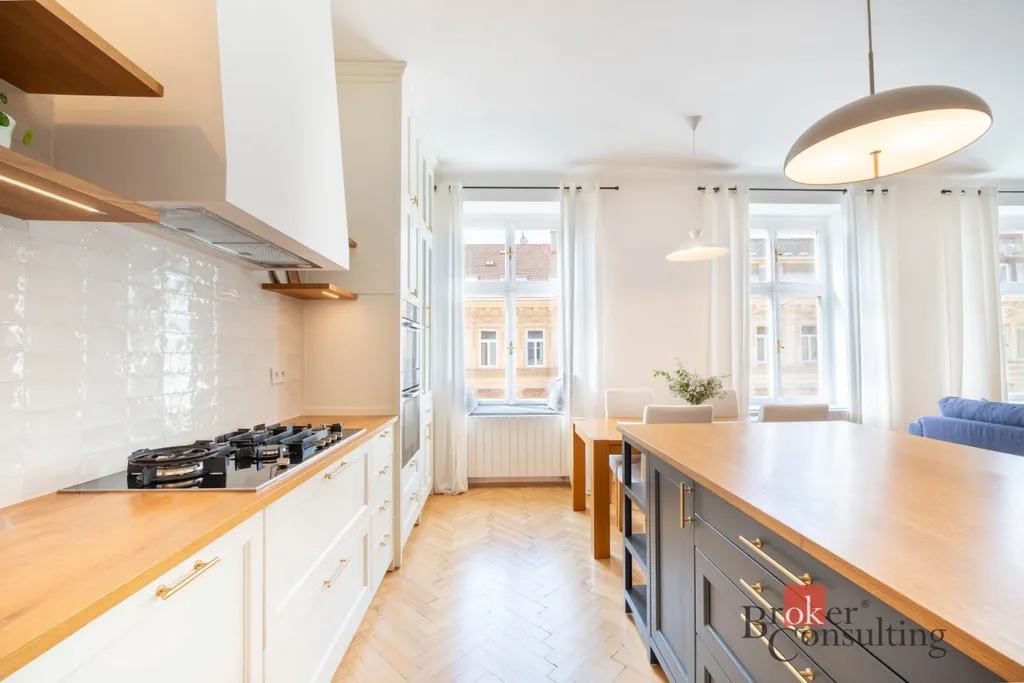 Celý byt se vyznačuje vysokými stropy a velkými okny ve všech místnostech, díky nimž je interiér přirozeně prosvětlený a působí velmi prostorně. Hlavní obytný prostor tvoří velkorysý obývací pokoj propojený s kuchyní vyrobenou na míru z masivu. Ta byla navržena s důrazem na detail i celkovou harmonii interiéru a je vybavena kvalitními značkovými spotřebiči Miele.