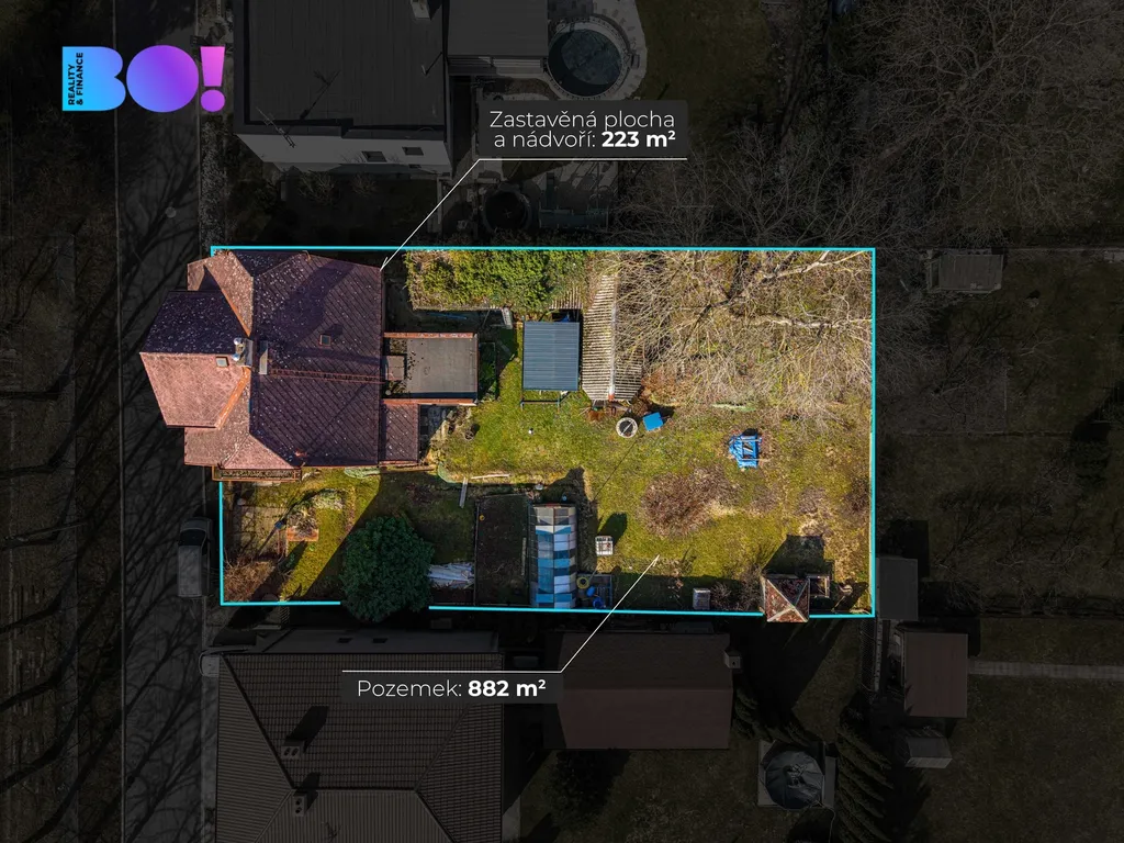 Dům má podlahovou plochu 223 m² a nachází se na pozemku o velikosti 882 m².