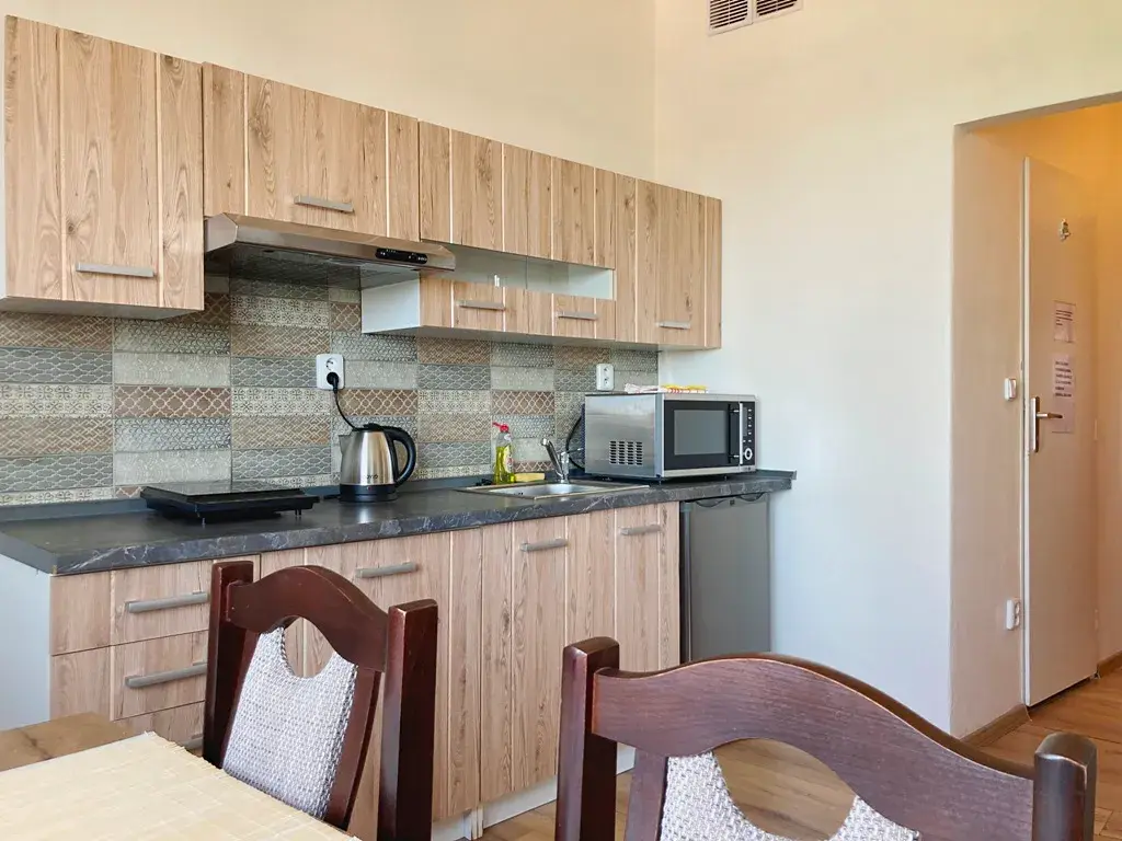 Byt byl kompletně a vkusně rekonstruován. Z předsíně jsou samostatné vstupy do kuchyně, koupelny a na wc. Na prostornou kuchyni, ve které je vybavená kuch. linka a velký jídelní stůl, navazuje velký obytný pokoj. Byt je vybavený a cena nájmu obsahuje také užívání vybavení. Okna bytu jsou orientována na severozápad, byt je příjemně světlý, ale nepřehřívá se. K bytu dále náleží komora - úložného prostoru je tedy dostatek. Je také možnost využít společný balkón na chodbě domu.