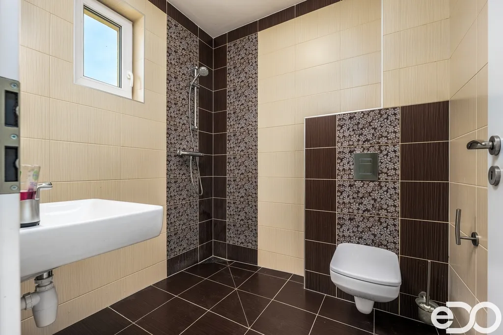 Vytápění je zajištěno elektrickým bojlerem a podlahovým topením.