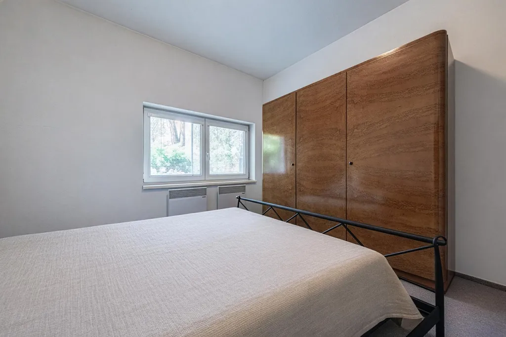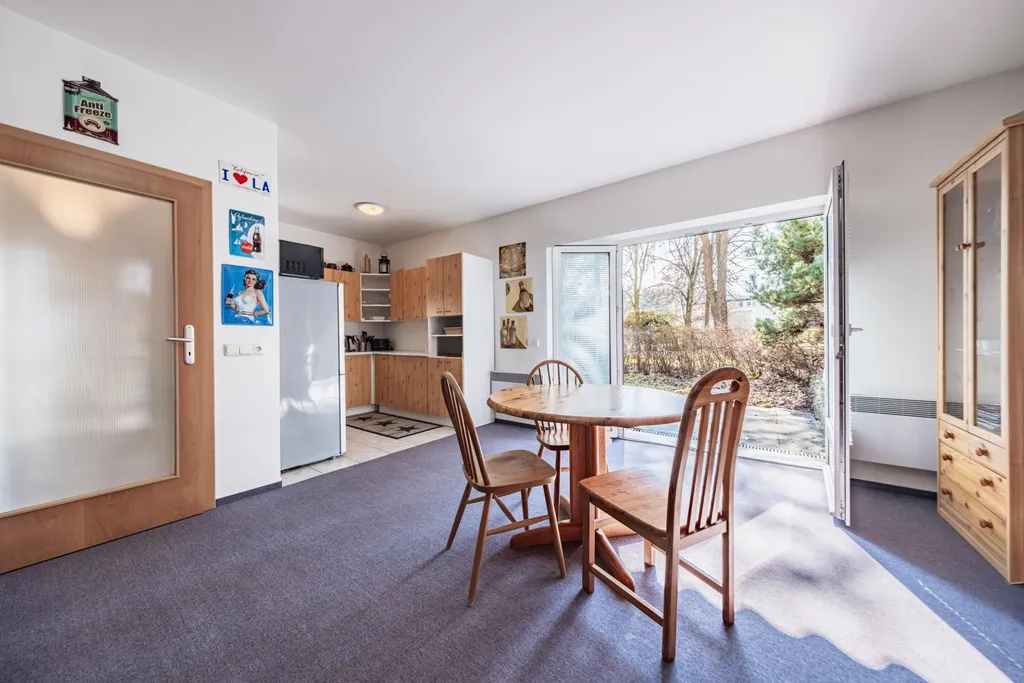 Byt je velmi dobře dispozičně řešen, prostorný obývací pokoj s kuchyňským koutem s přímým výhledem do zahrady o velikosti 24,79 m and sup2;, pokoj 10.10 m and sup2;, pokoj 11 m and sup2;, koupelna a WC 4,70 m and sup2;, předsíň 3,44 m and sup2;. Vybavení bytu je součástí kupní ceny. Celý objekt je oplocen, na rozlehlé zahradě se nachází venkovní posezení s grilem pouze pro obyvatele domu.