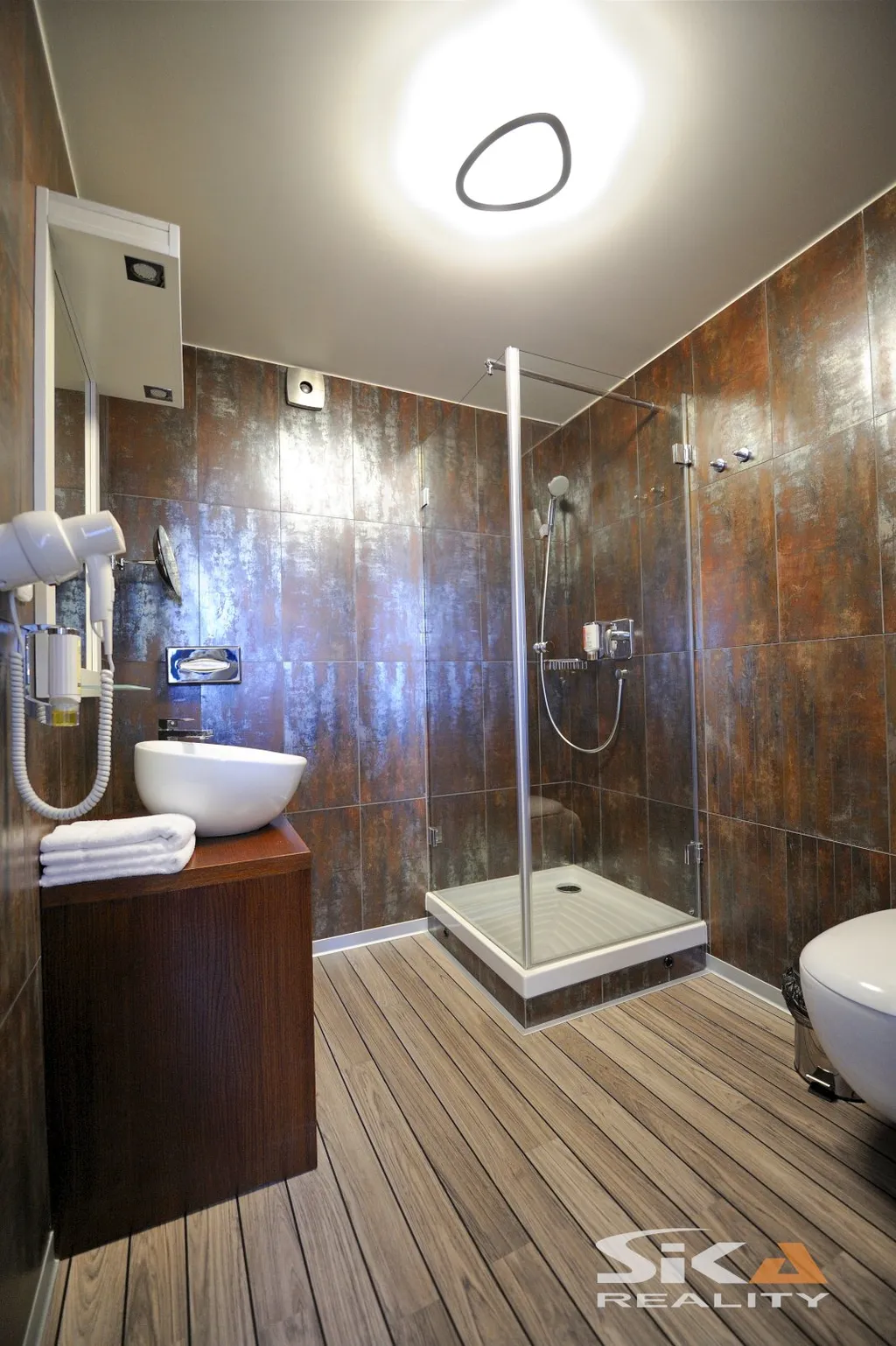 Klíčové parametry nemovitosti: Lokalita: historické centrum města Louny – nejprestižnější adresa ve městě. Dispozice: 1 podzemní podlaží, 4 nadzemní podlaží a využité podkroví. Kapacita: 10 plně vybavených pokojů (6 dvoulůžkových, 4 jednolůžkové). Vybavení: Osobní výtah, vybavená kuchyně, lobby bar, zastřešené atrium. Navíc: Venkovní terasa postavená přímo na městských hradbách se zastřešeným pódiem. Bonus: Nemovitost je nabízena včetně inventáře a vybavení.
