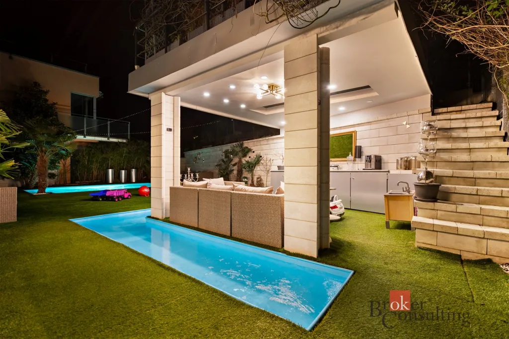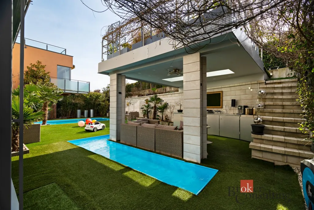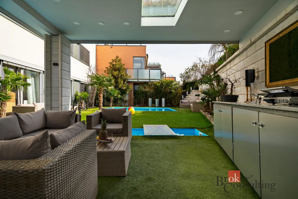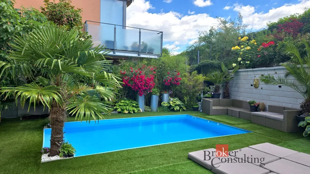 Velkým benefitem této nemovitosti je soukromá zahrada, která vytváří ideální zázemí pro rodinný život i relaxaci. Najdete zde bazén s protiproudem pro každodenní odpočinek i aktivní využití a díky přímému vstupu ze všech obytných místností působí zahrada jako přirozené rozšíření interiéru. Celý prostor tak nabízí příjemné soukromí a komfort, který běžné byty jen zřídka poskytují. Součástí zahrady je také vyvýšená terasa s příjemným výhledem na okolí Plzně. Tento prostor je ideální pro relaxaci, večerní posezení nebo ranní kávu – oddělený od hlavní části zahrady, a přesto s ní propojený.