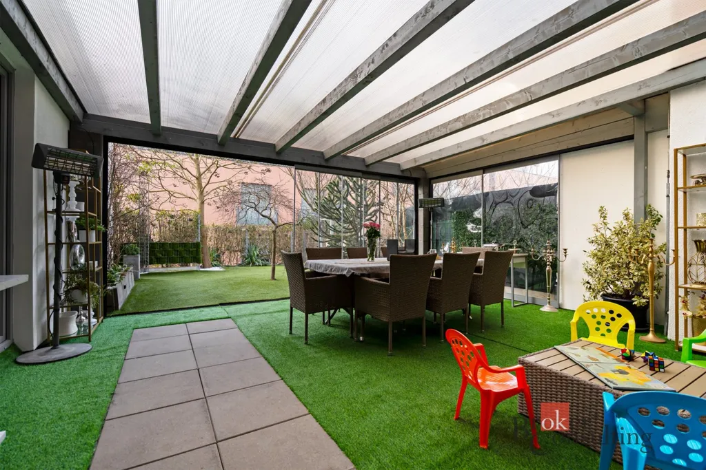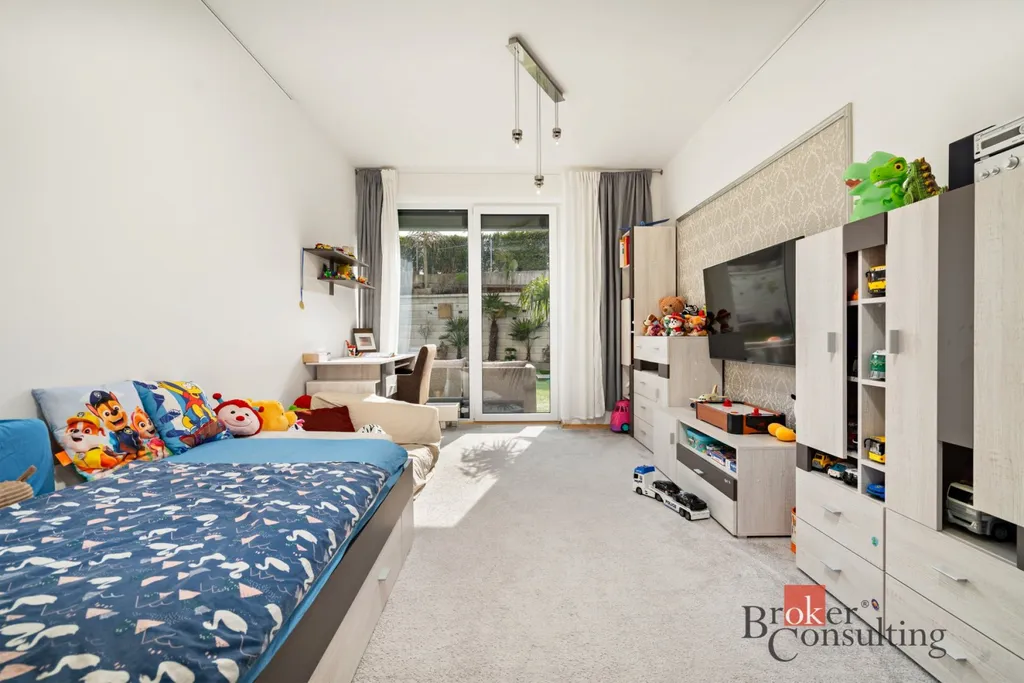 Dispozice je navržena s důrazem na praktičnost i každodenní komfort. Dominantou bytu je prostorný obývací pokoj s kuchyňským koutem a jídelní částí, ze kterého je přímý vstup na terasu. Tento prostor přirozeně navazuje na zahradu a tvoří srdce celého bydlení. Byt dále nabízí čtyři samostatné pokoje, které umožňují flexibilní využití – ložnice, dětské pokoje, pracovna či pokoj pro hosty. Hlavní ložnice disponuje šatním prostorem a poskytuje dostatek soukromí. Velkoformátová okna jsou navíc vybavena venkovními žaluziemi, které zajišťují optimální regulaci světla, příjemné klima v interiéru a dostatek soukromí. Dvě koupelny a samostatné WC výrazně zvyšují komfort pro vícečlennou rodinu.