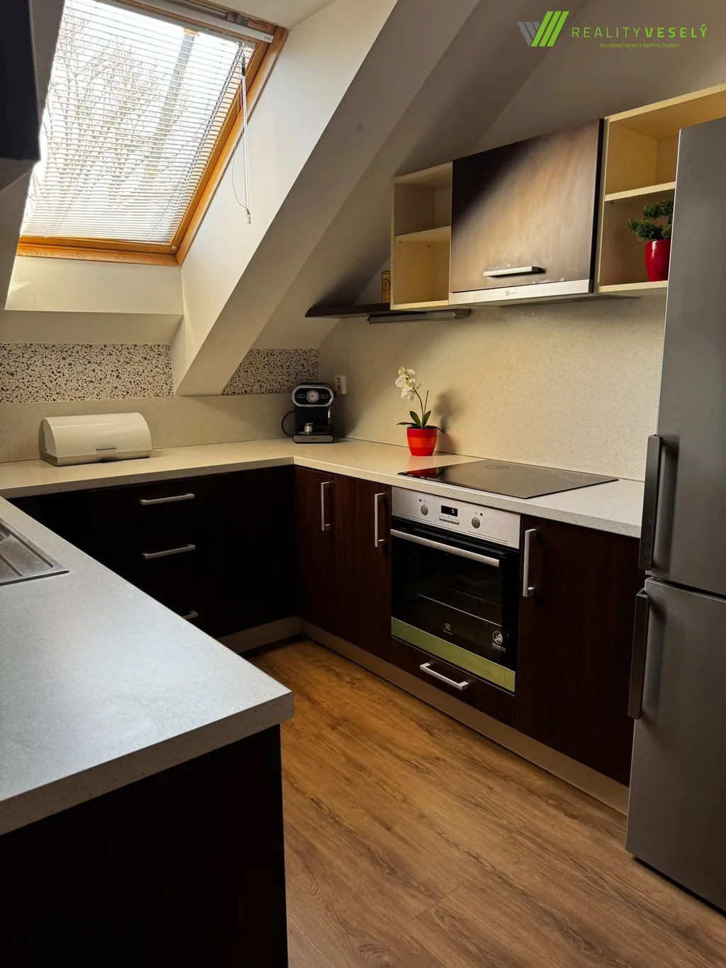 Byt se nachází v posledním patře bytového domu, což zajišťuje dostatek soukromí i příjemnou atmosféru podkroví. Dominantou je prostorný obývací pokoj s kuchyňským koutem, který je díky střešním oknům krásně prosvětlený. Kuchyňská linka je moderní a prakticky řešená, včetně vestavěných spotřebičů.