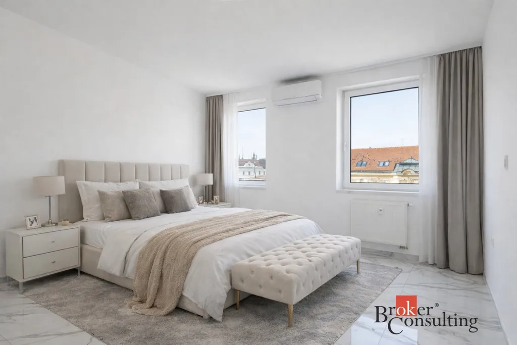 Nabízíme k pronájmu exkluzivní, luxusně zrekonstruovaný a kompletně klimatizovaný byt na ulici Koblížná 3 o dispozici 4+kk s celkovou výměrou 200 m², z toho 95,3 m² činí podlahová plocha a 104,7 m² představují prostorné venkovní terasy. Nemovitost se nachází v samotném srdci Brna na ulici Kobližná a nabízí kombinaci moderního designu, nadstandardních materiálů a mimořádně světlého, vzdušného interiéru. V celém bytě je zároveň připravena instalace venkovních žaluzií.