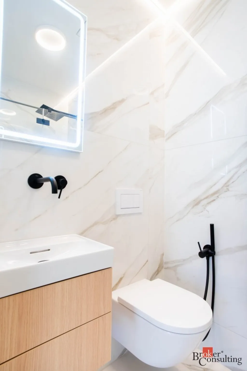 V bytě se nacházejí dvě designové koupelny – jedna vybavená prostornou vanou a toaletou a druhá se sprchovým koutem a taktéž s toaletou. Elegantní chodba s efektním kulatým zrcadlem dotváří luxusní atmosféru celého interiéru a poskytuje dostatek prostoru a úložných možností.