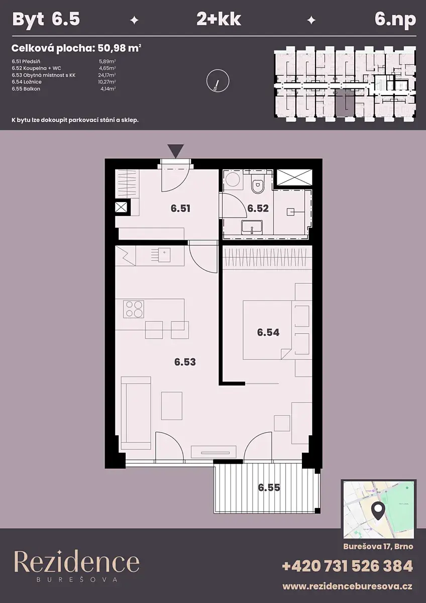 Nabízíme k prodeji moderní byt 2+kk o podlahové ploše 46,90 m2 s balkonem 4,10 m2 nacházející se v námi připravovaném projektu Rezidence Burešova v atraktivní lokalitě Veveří. Byt se nachází v 6.NP, orientace bytu do ulice, severní strana. K bytu lze koupit parkovací místo v zakladači i sklad.